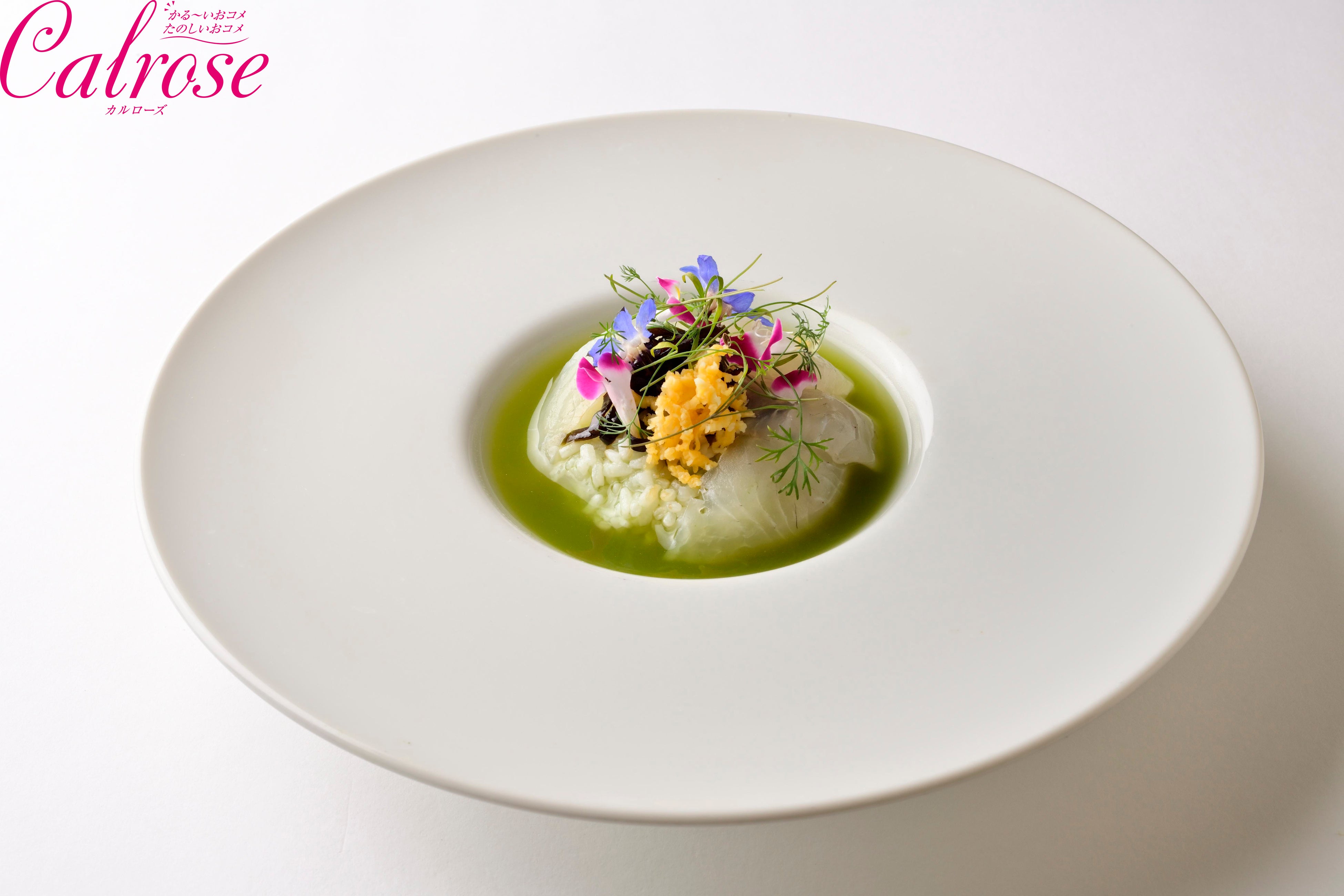 作品紹介:塩とオリーブオイルでマリネしたスズキと、炊いてコルビージャックチーズを混ぜ入れたカルローズ、ソテーしてチーズをかけたシイタケ、昆布の佃煮、ドライトマト、オカヒジキなどを組みあわせ、昆布だしとスズキの骨だしに緑茶も合わせただしを注ぐ。和食材のうま味が生きた洋風茶漬け。