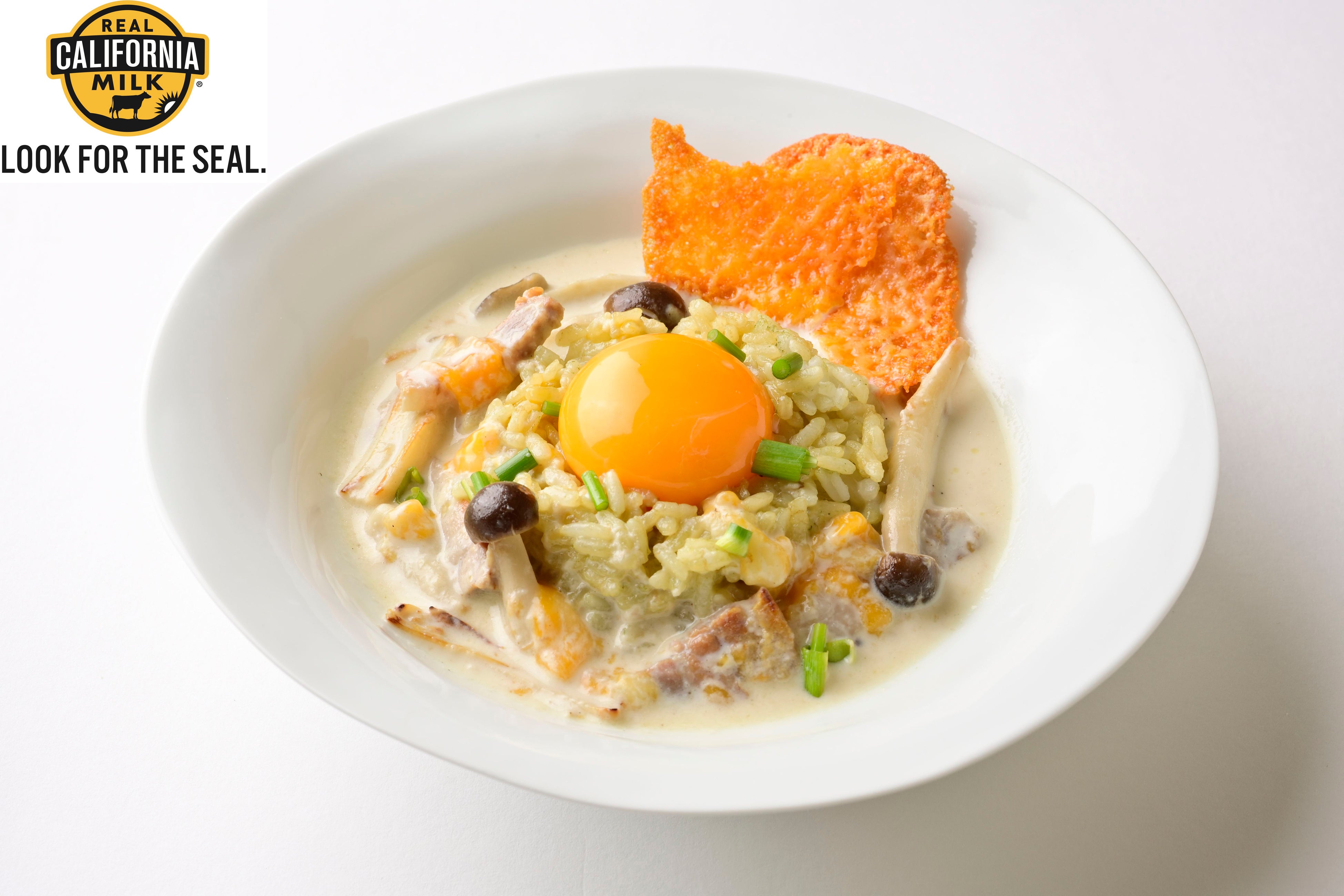 作品紹介:緑茶と出汁で炊いたカルローズに、ベーコン、しめじ、コルビージャックチーズ、牛乳、白だしで作った和風のカルボナーラスープを注ぎ、卵黄を崩しながら食べて、粒感のあるカルローズとさらさらとしたソースとの好相性を楽しむ一品。加熱したコルビージャックチーズも添えて二つの食感を演出。