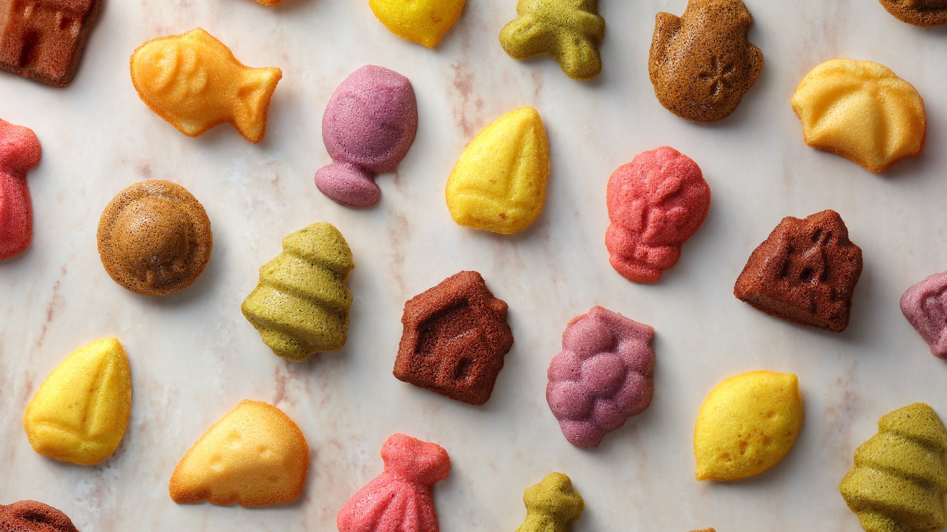 外せない注目アイテムは、フランスのさまざまな街をイメージした缶入りの「トゥジュール」シリーズ。色とりどりの10種の缶には、マドレーヌ4種とカギの形の「キーチョコレート」1つが入っています。マドレーヌの種類は缶によって少しずつ異なり、シェル(貝殻)型のバターマドレーヌといった定番アイテムに加え、ユニークなフレーバーが。たとえば「パリ」にはエッフェル塔をかたどったピスタチオマドレーヌ、「ボルドー」にはワイングラス型のレザン(ぶどう)マドレーヌなど、各都市にまつわるアイテムが2個ずつ入っています。