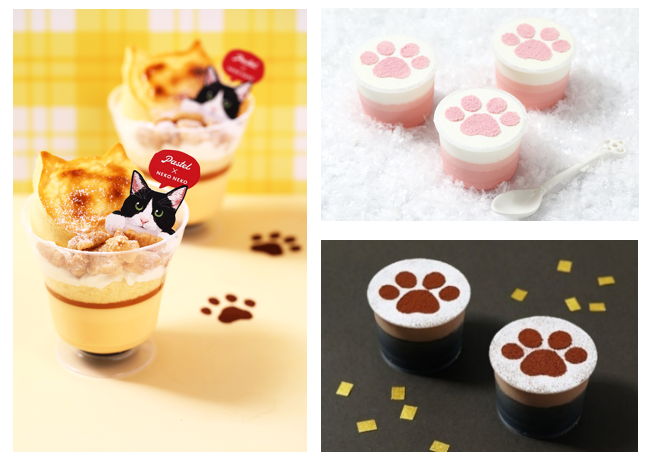 そしてこのたび、同じくオールハーツ・カンパニーが展開する‟ねこ“をモチーフとしたフードブランド「ねこねこ」とコラボレーションした新商品『にゃんチープリンパフェ』※2、『Holiday’sニャめらかプリン(イチゴ)』と、2020年よりブラックフライデーの期間限定で販売し、大変ご好評をいただいている『ニャめらかブラックプリン』を全国の「パステル」で販売いたします。