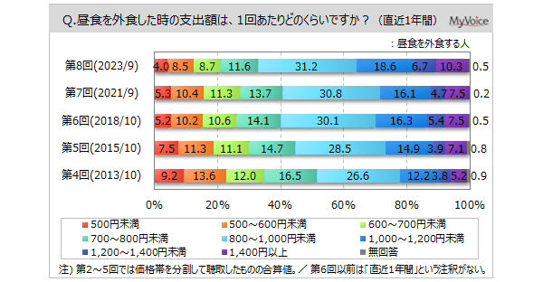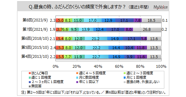<今 回>(2023/9)https://myel.myvoice.jp/products/detail.php?product_id=30207 上記設問の他に、夕食時の外食でも同様の設問を聴取しています。 <第7回>(2021/9)https://myel.myvoice.jp/products/detail.php?product_id=27806 <第6回>(2018/10)https://myel.myvoice.jp/products/detail.php?product_id=24307 |