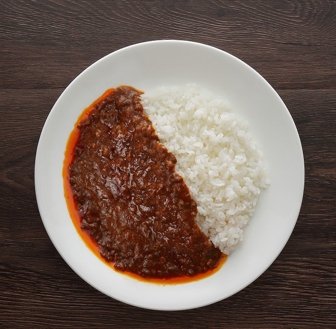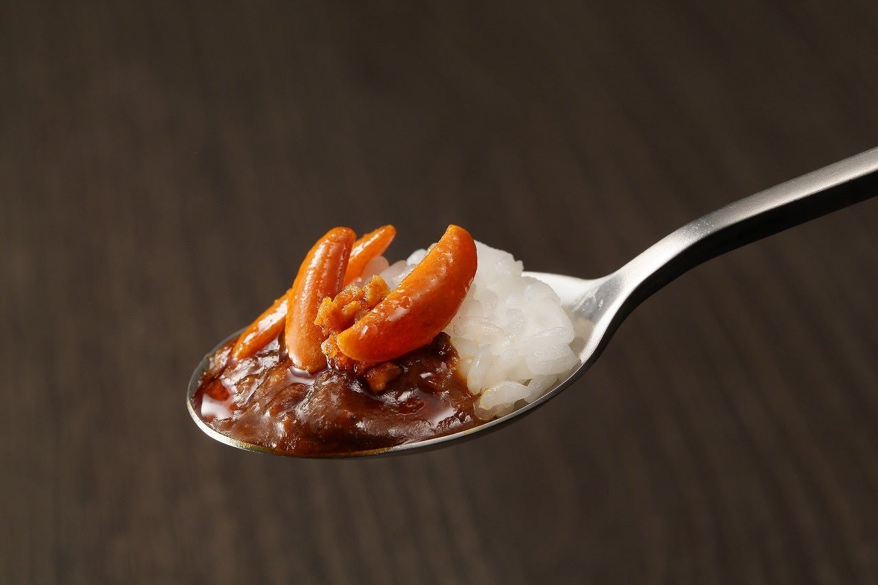 カレーの味付けには、「柿の種のオイル漬け にんにくラー油」の味の決め手である、ラー油調味料、フライドガーリック、フライドオニオン、クラッシュ柿の種を使用しました。クラッシュ柿の種はルーに溶け込み、隠し味として旨味とコクを引き立てます。