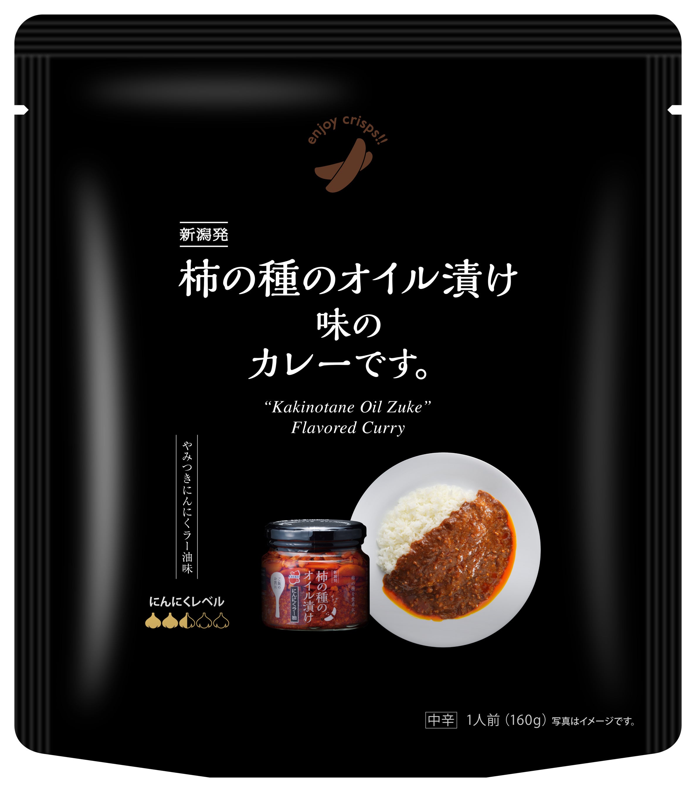 そこで発売から5年を迎え、新潟土産として認知されてきた「柿の種のオイル漬けシリーズ」はカレーに着目し、「柿の種のオイル漬け味のカレーです。やみつきにんにくラー油味 中辛」を発売しました。「柿の種のオイル漬け にんにくラー油」の風味に仕上げた新潟ならではの味を、家族や友人、ご自分へのお土産にぜひご利用ください。