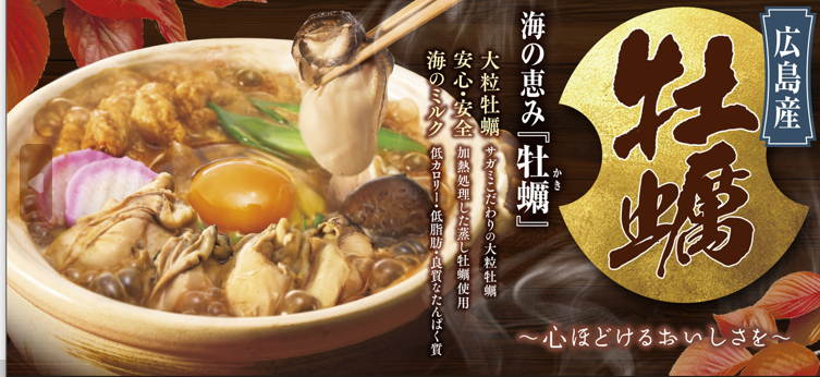 海のミルクと言われる牡蠣は、低カロリー・低脂肪で良質なたんぱく質を含んでおります。また、加熱処置された蒸し牡蠣を使用するため安心・安全です。広島県産の大粒牡蠣を使用した彩り豊かなメニューをご提供いたします。
