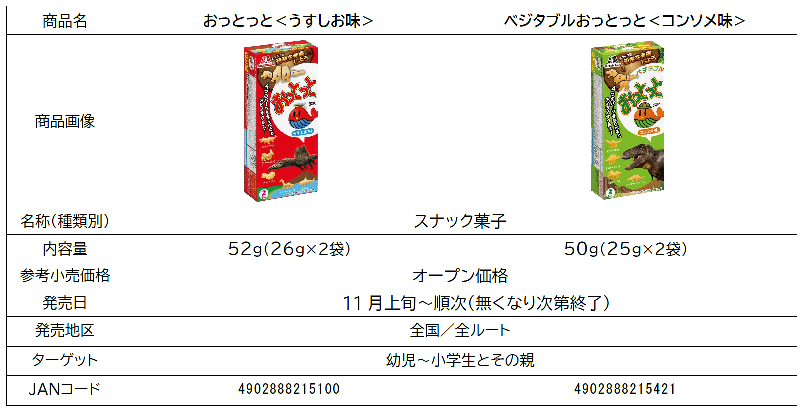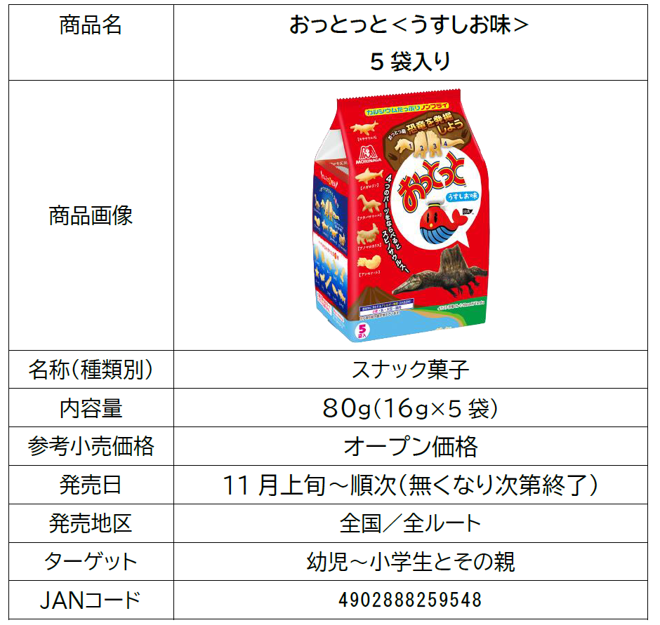 「おっとっと」は、1982年に発売し、ノンフライ製法で仕上げた、中空の軽い食感と繊細な菓子型が特長のスナック菓子です。今回人気の「恐竜・古生物」をテーマに全12種の菓子型をお楽しみいただけます。(「おっとっと<うすしお味>」では、水辺をテーマにした6種類、「ベジタブルおっとっと<コンソメ味>」では陸をテーマにした6種類の菓子型)