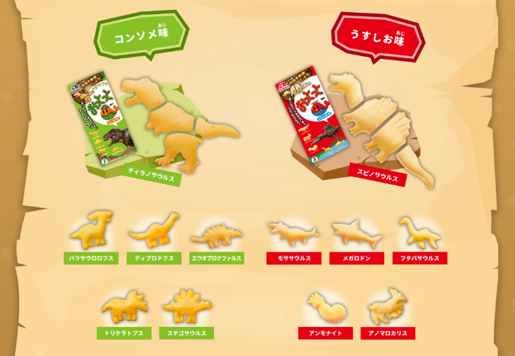 菓子型は通常の型に加え、ティラノサウルス・スピノサウルスの組み合わせ型が登場し、4つのパーツを探してならべる楽しさを体験することができます。(ティラノサウルスは「ベジタブルおっとっと<コンソメ味>」、スピノサウルスは「おっとっと<うすしお味>に入っています)