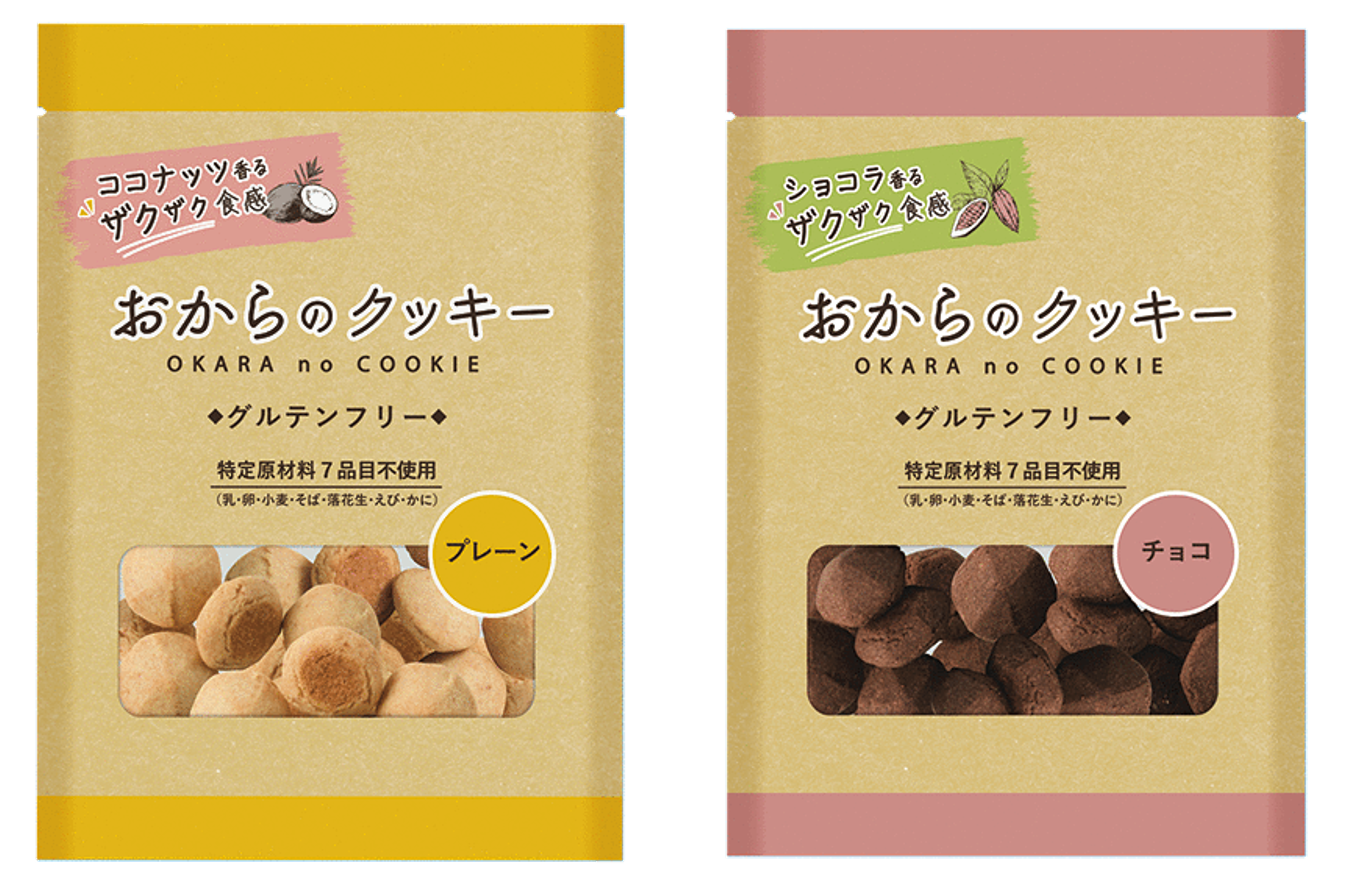 今回発売する「おからのクッキー」は、国産米粉やてんさい含蜜糖をはじめ、厳選したこだわり原材料を使用しております。素材本来のやさしい味わいで、ザクザクした食感が特徴です。味はプレーンとチョコの2種類。保存にも便利なチャック付きなので、毎日のおやつタイムや仕事の合間にもぴったりです。プラントベースかつグルテンフリーのクッキーを、ぜひ一度ご賞味ください。
