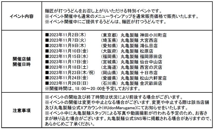 丸亀製麺のおいしさの軸を決め、全国の職人へ技術と想いを伝承している“麺匠”が全国各地へ赴き、匠の技を尽くしたうどんをご提供するイベントを開催いたします。丸亀製麺公式Xにて募集し、皆さまからいただいた数多くのご応募の中から、全国10ヶ所の開催店舗が決定いたしました。11月2日(木)の東京を皮切りに、北海道から九州までを約1ヶ月間でまわります。中には、麺匠イベントをまだ開催したことのない地も含まれます。