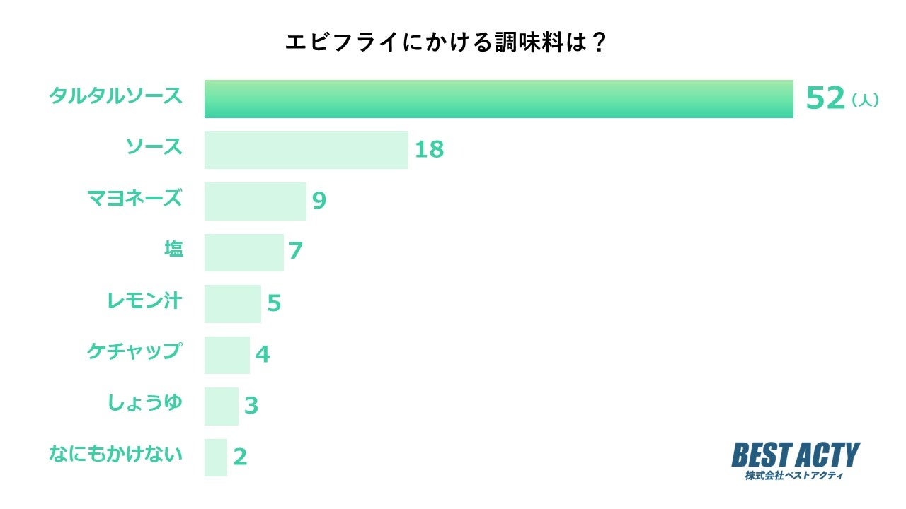 エビフライにかける調味料について100人にアンケートを行ったところ、「タルタルソース」と回答する人が最も多い結果となりました。