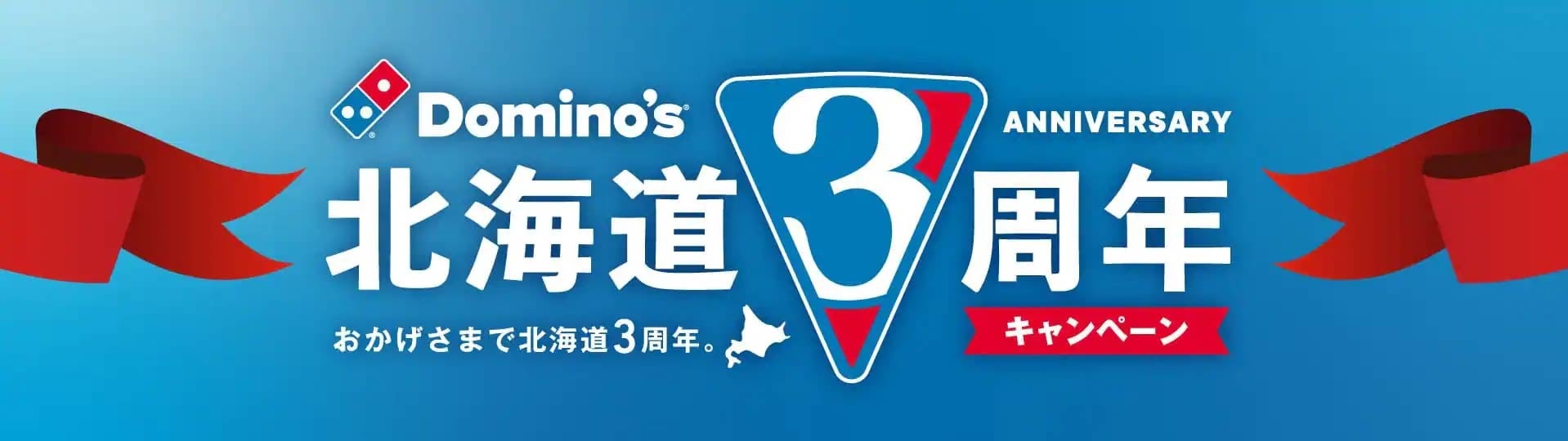 ドミノ・ピザは、2020年11月27日に、北海道へ再出店を果たして以来、道民の皆さまにご愛顧いただき、2022年11月に再出店3年目に突入しました。そこで、2023年11月27日の3周年記念日を目指し、年間を通しておトクで楽しい企画を開催する「北海道3周年キャンペーン」を、北海道限定でロングラン実施しています。