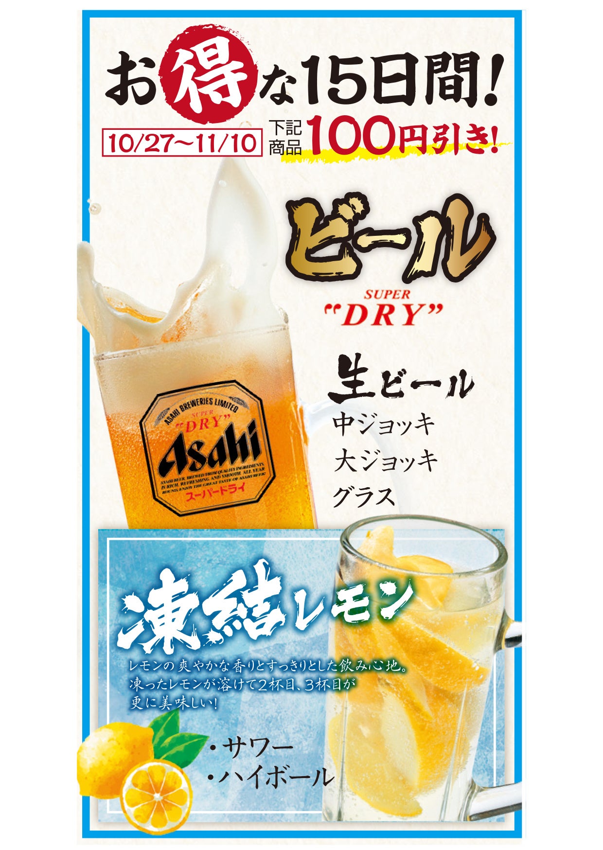 10/27(金)からは、生ビールや凍結レモンサワーなどがお得にお召し上がりいただける『秋のアルコールフェア』もスタートいたします。