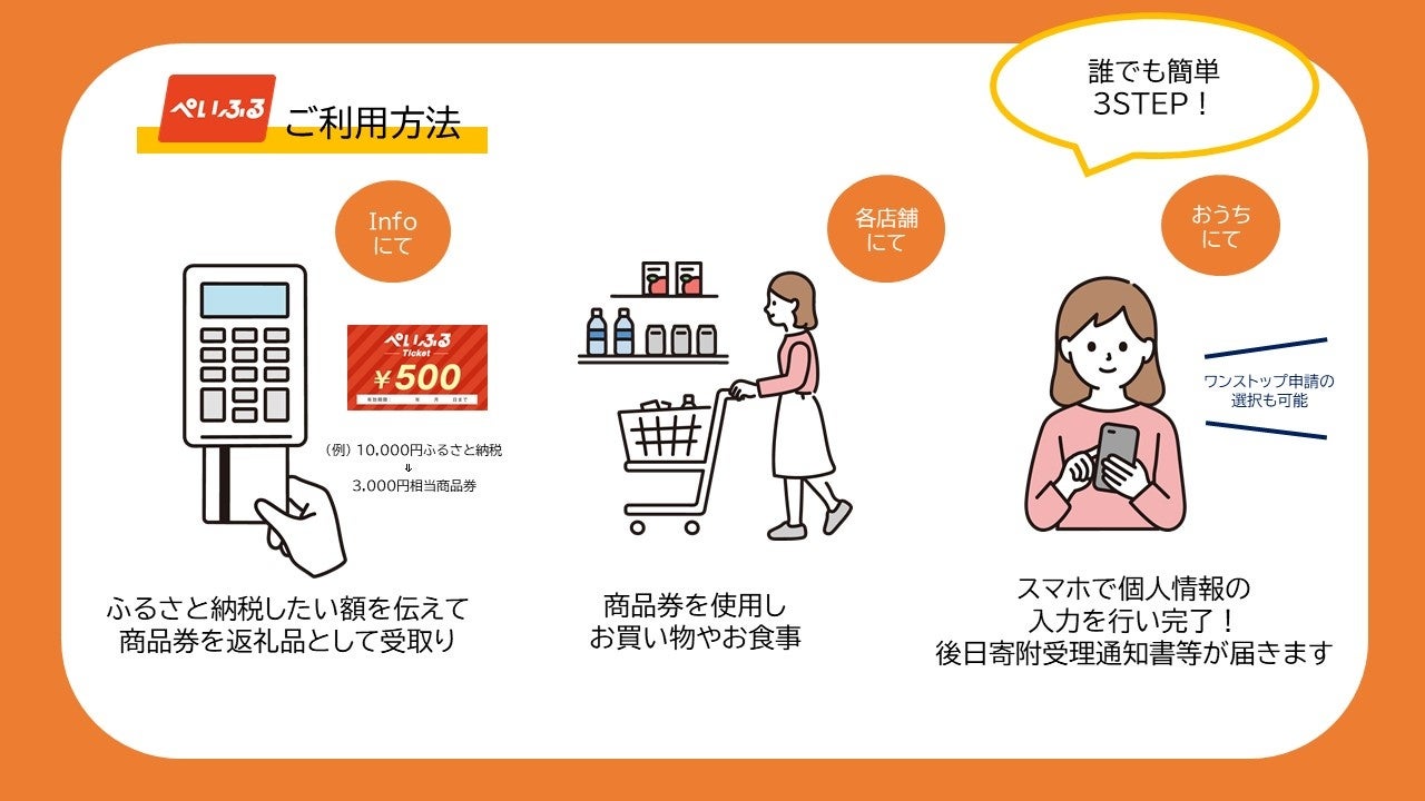 事前の登録・手続きやスマートフォンなどへのアプリのインストールが不要で、クレジットカード1枚でいつも通りにお会計、携帯電話で1分申請、その場で返礼品として商品のお買い物などができます。