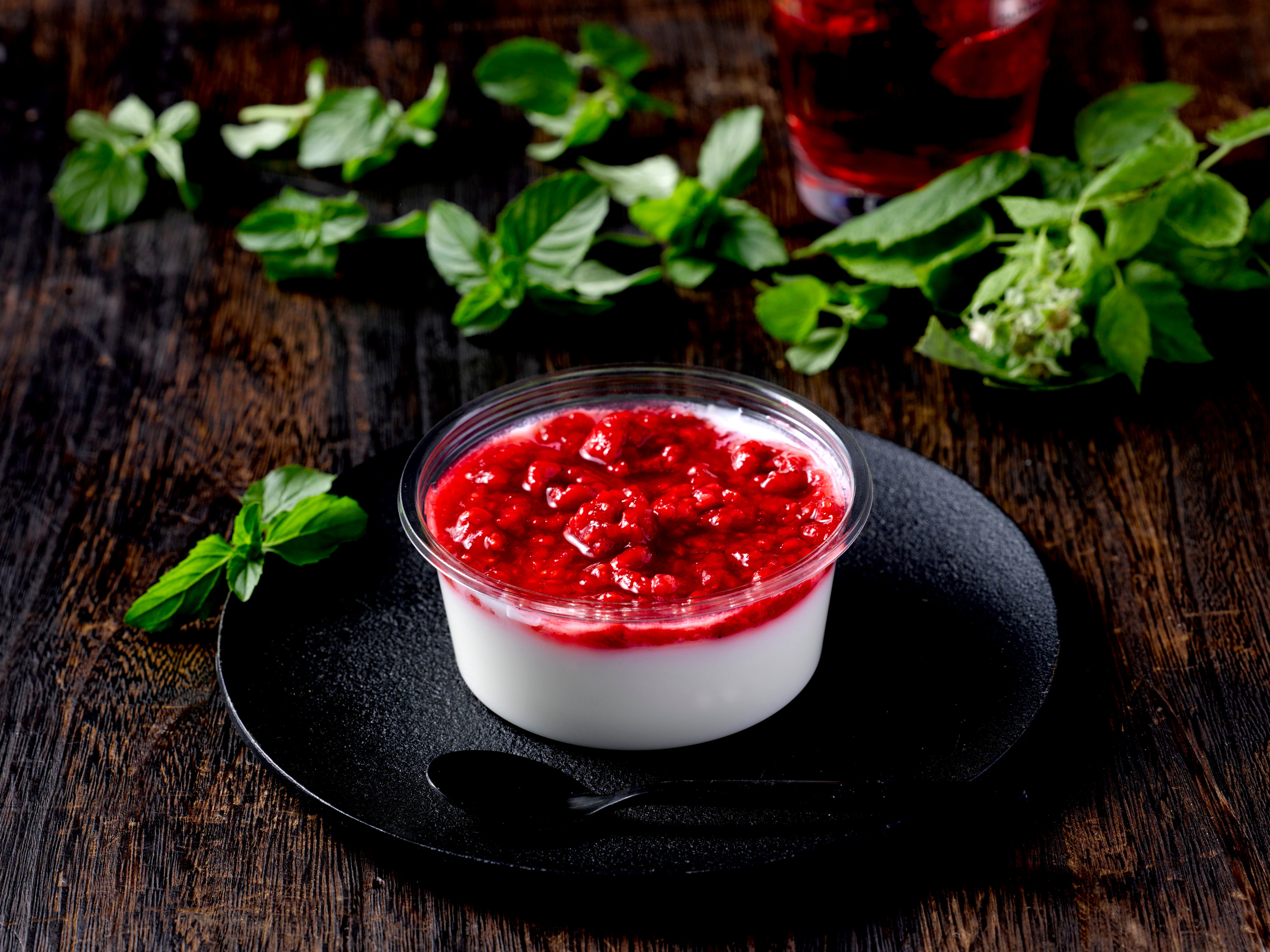 フレッシュなラズベリーを店内でコトコト煮込み甘酸っぱいソースに仕上げ、自家製の牛乳寒天のソースに仕上げました。