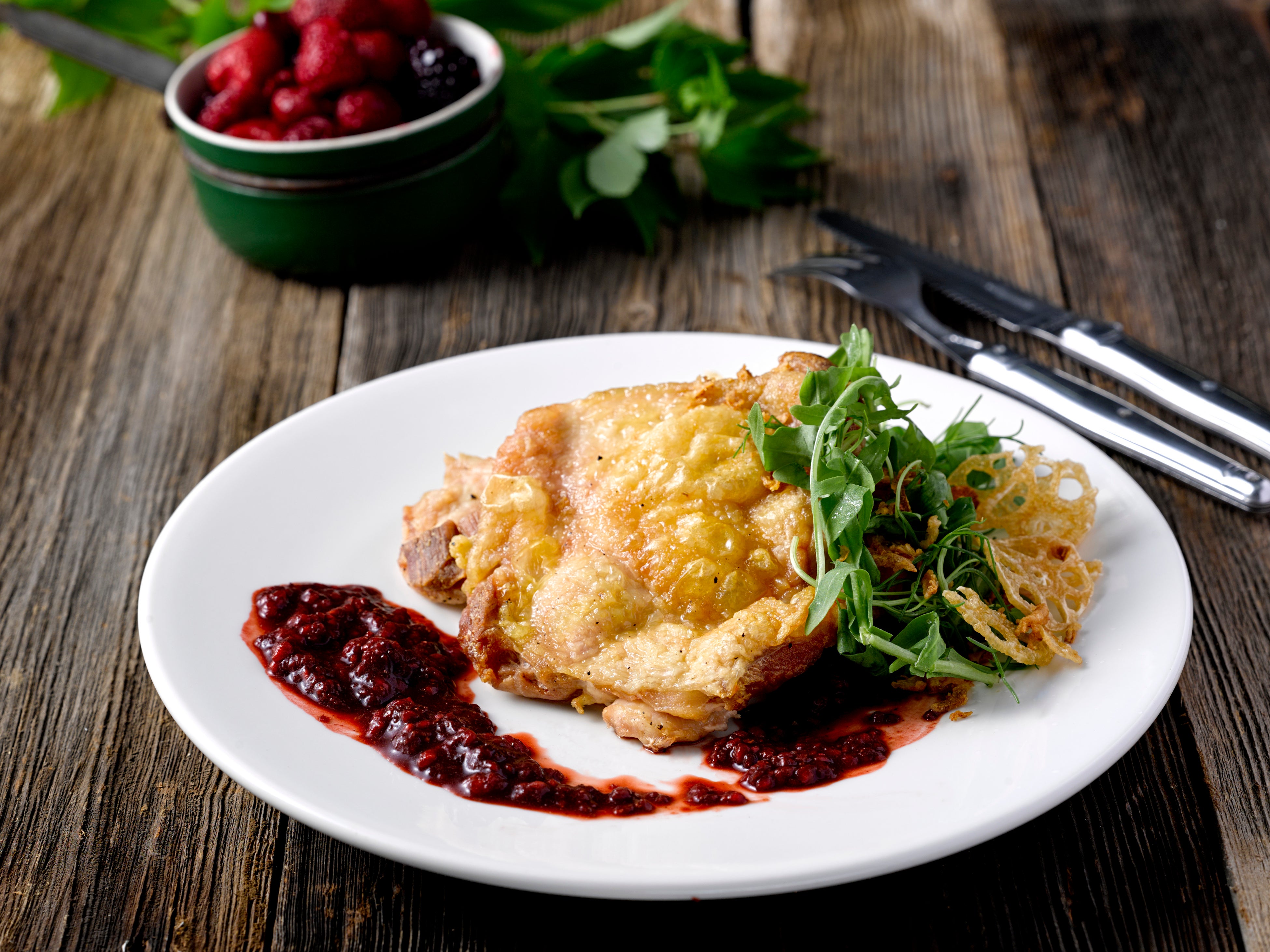 ハーブでマリネされた鶏モモ肉をラズベリーとバルサミコの甘酸っぱいソースでお召し上がりいただけます。