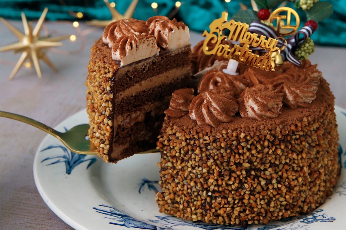 きめ細やかなショコラジェノワーズ生地に、アーモンドとへーゼルナッツのプラリネクリームをサンドしました。