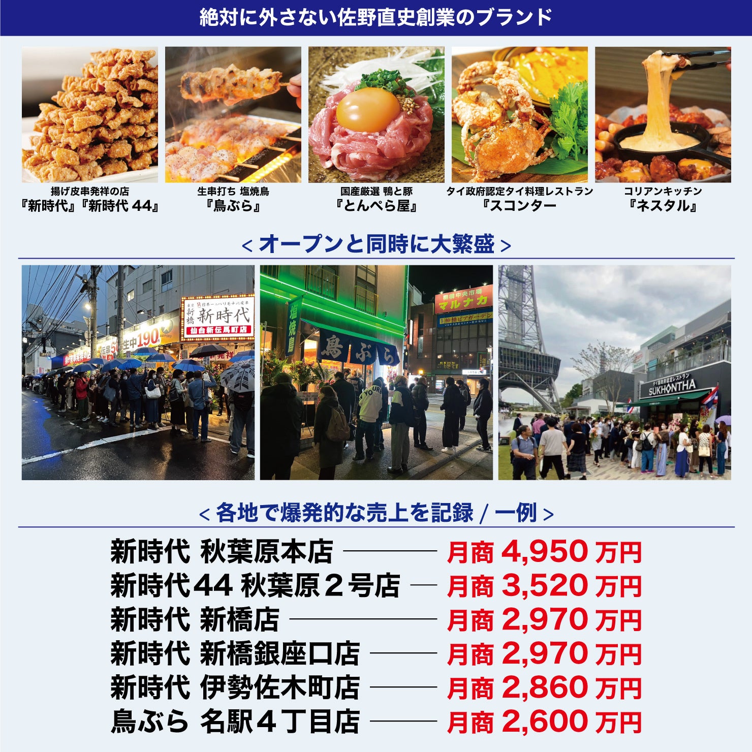「新時代」、「新時代44」、「鴨と豚料理とんぺら屋」、「生串打ち塩焼鳥 酒場ブラジル」、「タイ王国政府認定レストラン スコンター」、「韓国料理ネスタル」の計6ブランドの飲食店を首都圏を中心に全国に150店舗を展開しています。