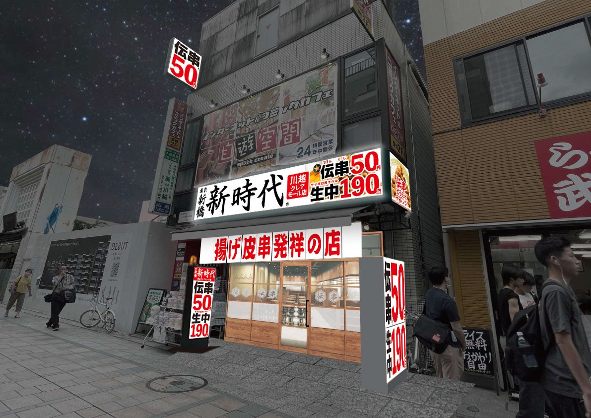 「新時代」は、『伝串』という商品が名物で、累計販売本数1億本を超えます。揚げ皮串発祥のお店です。