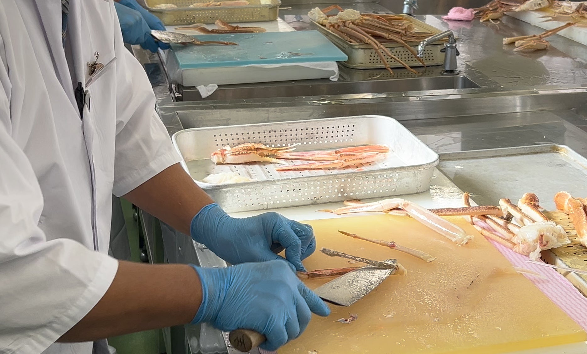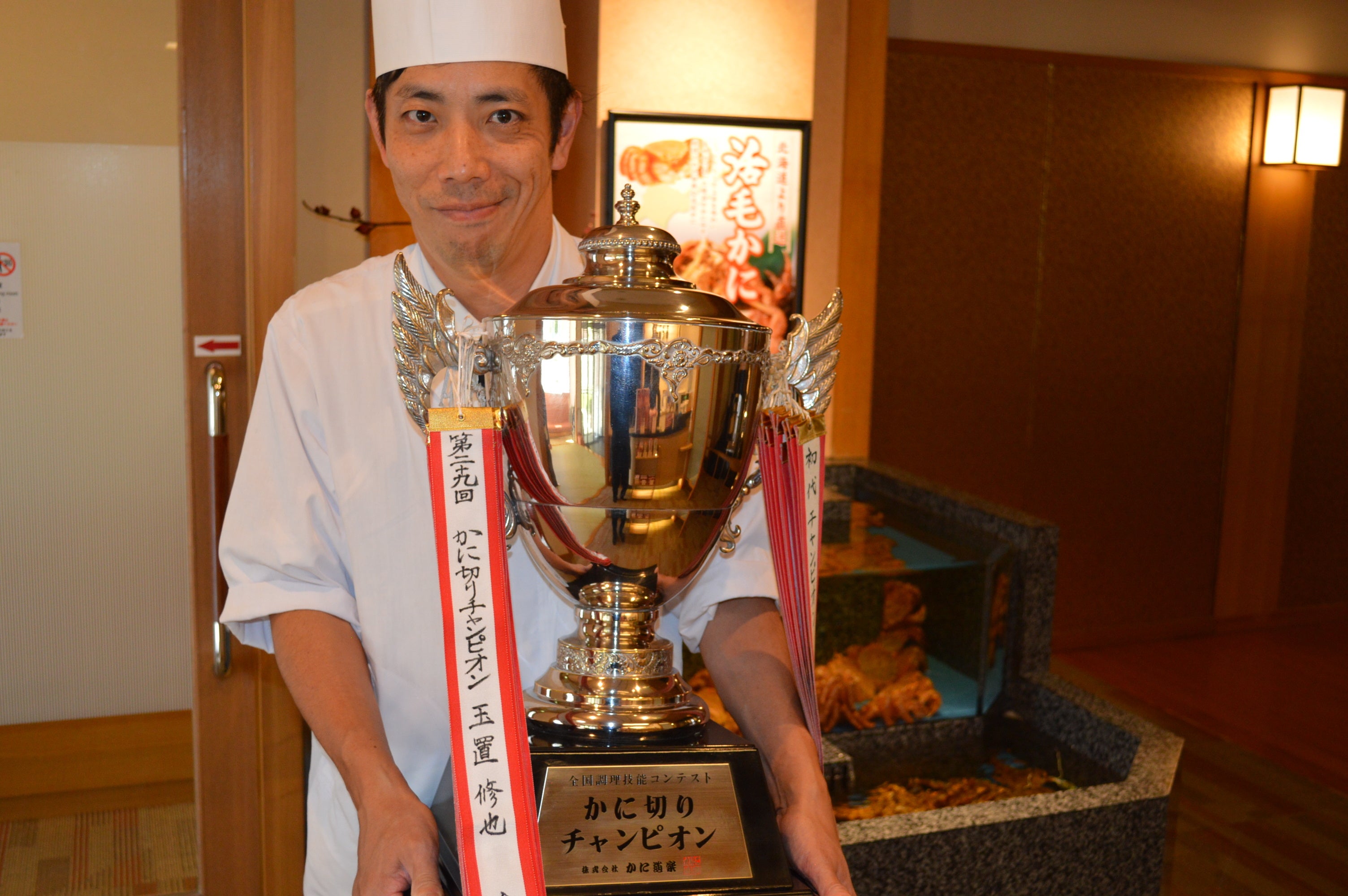 今回、2023年かに道楽全国技能コンテストにおいて、第29代かに切チャンピオンになりました。2019年より返り咲き2度目のかに切チャンピオン受賞となりますが、今回は併せて調理総合種目優勝という、2冠を達成することが出来ました。今回で29回という技能コンテストの歴史の中で、初の2冠達成とのこと非常に光栄なことではあるのですが、誰よりも当の本人が一番驚きを感じています。私自身、入社より30年という時間をかに道楽で過ごし、その中で少しずつ磨いてきた技術が 遅咲きながら、このような形で結果として実を結ぶこととなり非常に嬉しく思っています。今回、技能コンテスト予選通過が決定した後に、決勝に向けて練習を進めていたのですが、 ほんの少しいつもと違うかにの切り方に挑戦してみたところ、思いの外速く切れたことに驚きました 私の中で、これ以上はないだろうな、もう限界かな、と思っていた事がほんの些細な事でこれだけの年数を重ねても、まだまだ出来ることがあると発見出来た事が楽しくて仕方がありませんでした。自身を職人というのはおこがましいのかもしれないのですが、技術、知識の研鑽をし続けていく かにのエキスパートの職人として、この楽しみを探し続けそして、この技術、知識、経験を持ってお客様に最高のかに料理を提供出来る料理人でありたいと思います。