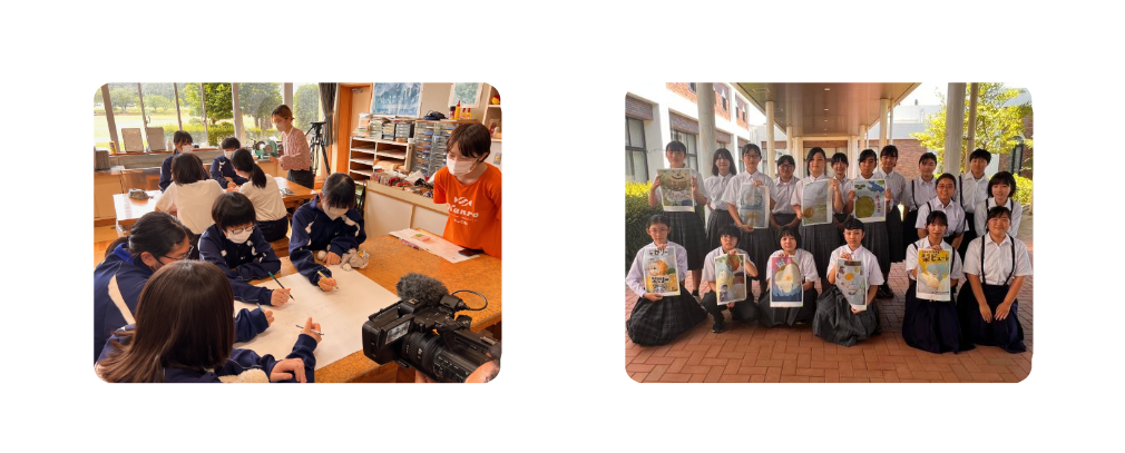 そしてそのピューレの為に、市内の霞ヶ浦中学校、下稲吉中学校、千代田義務教育学校の3校の美術部の中学生がフードロスや地域の果樹園の様子を捉えて筑波大学生アドバイスの元パッケージデザイン画を描き、商品の顔となる商品ラベルを製作いたしました。