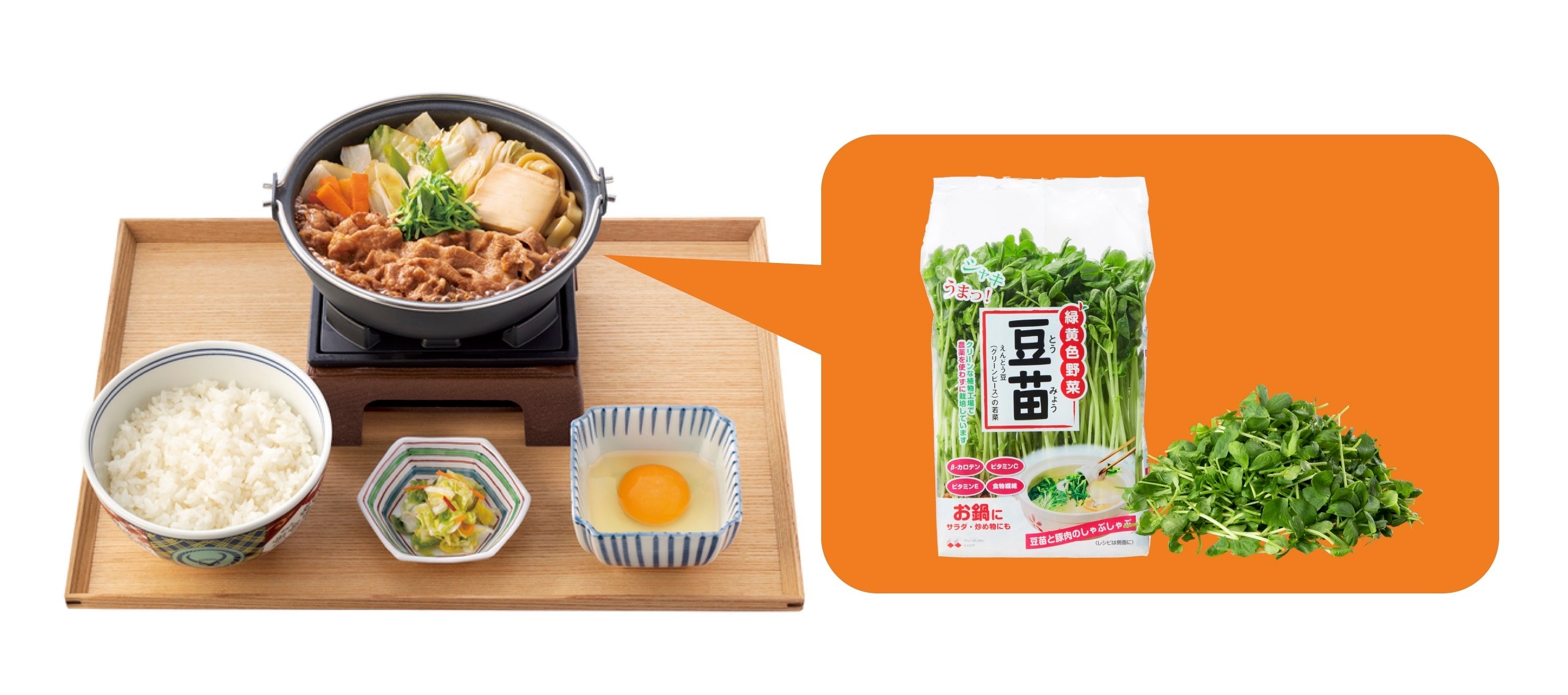 村上農園の豆苗が同商品に使用されるのは、2021年から続けて3年目。多くのお客さまが心待ちにしている『牛すき鍋膳』に、今年もおいしさと彩りを加えます。