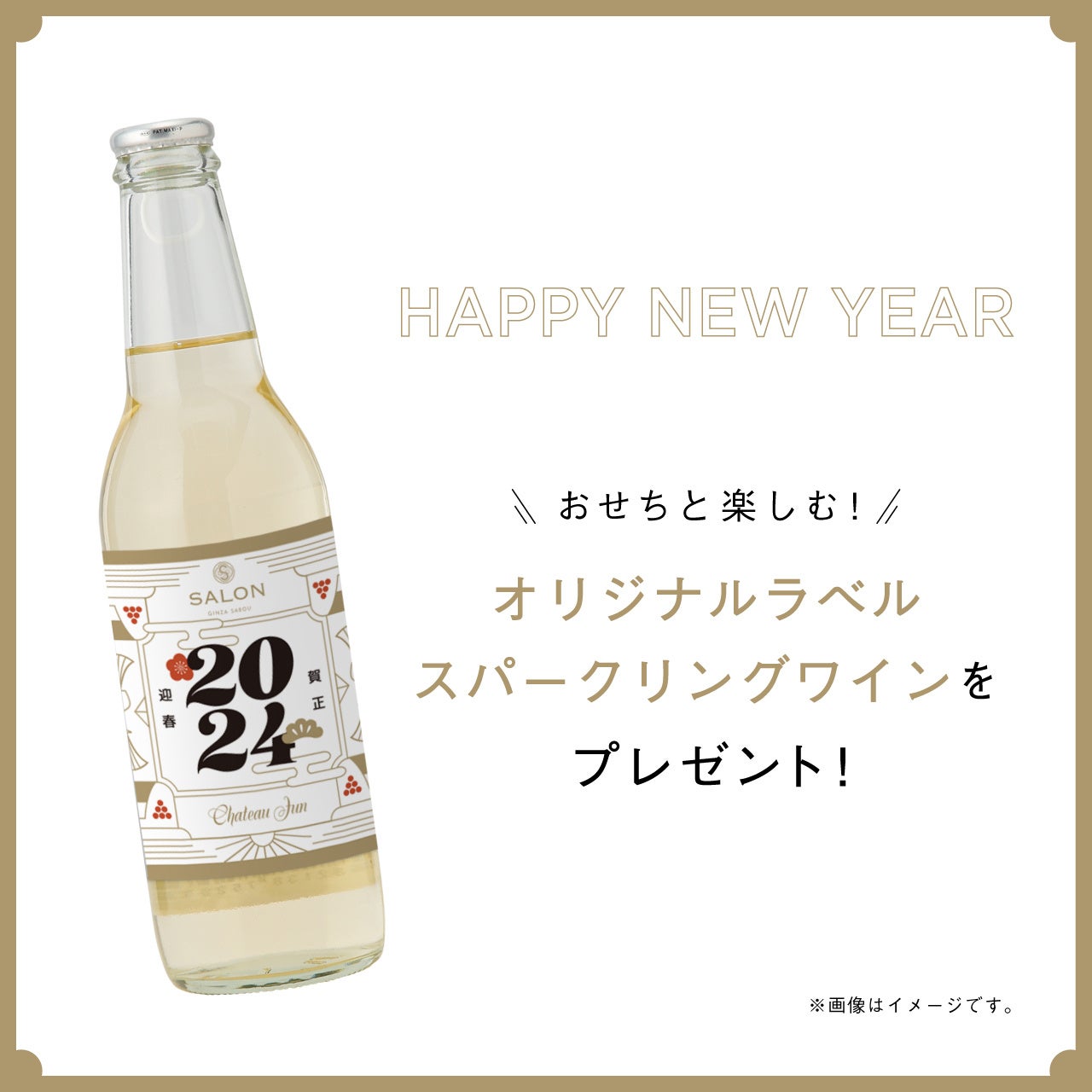 ジュングループのワイナリー「シャトージュン」で造られた、山梨県産の甲州ぶどうを100%使用した人気のスパークリングのハーフサイズを10月24日(火)~11月7日(火)までにご予約いただいた方限定50名様にプレゼント。爽やかな発砲が特徴の甘すぎないスパークリングワインで、乾杯酒や食中酒としても楽しめます。和柑橘を思わせる爽やかな酸味とほのかな甘味がおせちにも良く合います。