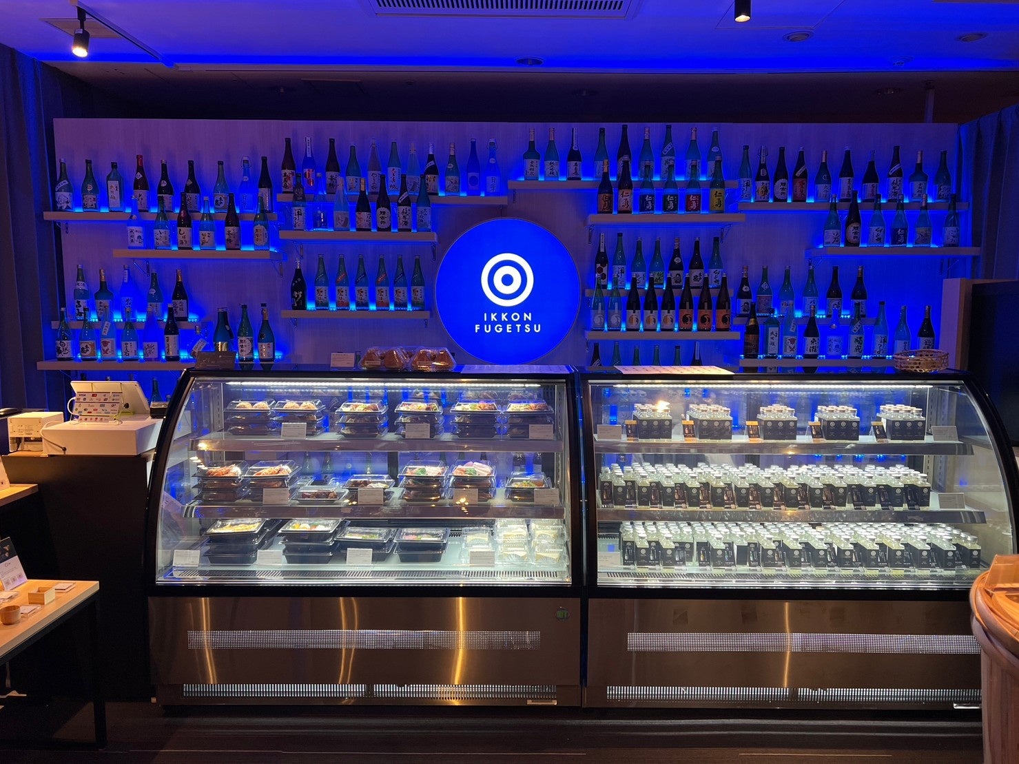 店内内装はPOPUP時同様の「Once in a Blue Moon」奇跡のブルームーンの一夜を。をイメージしたブルーライトが日本酒を美しく演出する店内什器を使用。