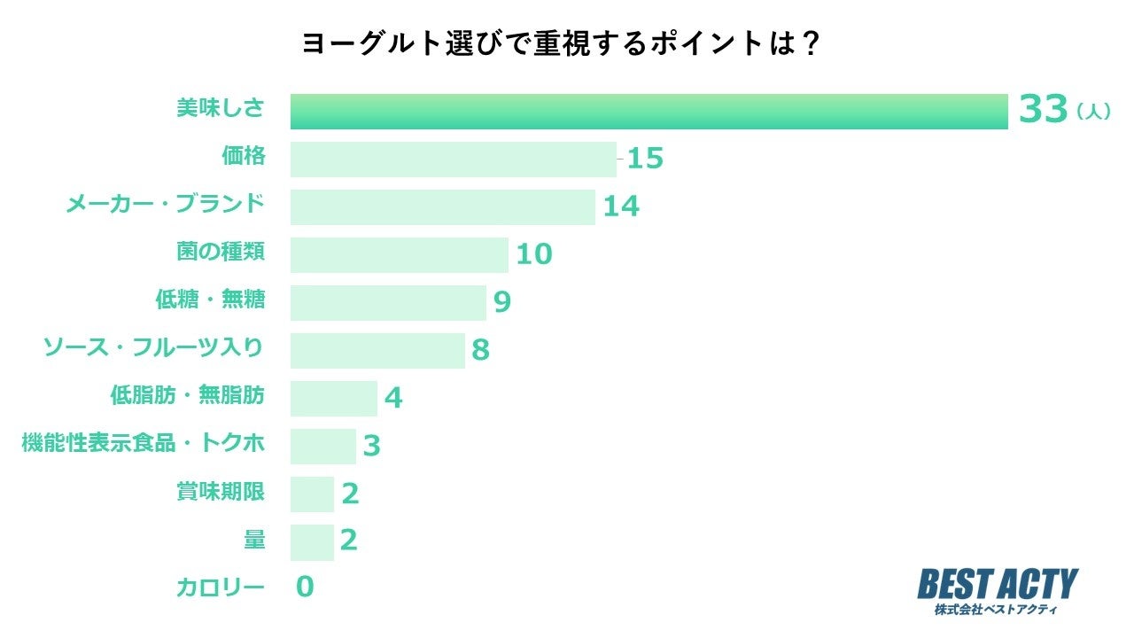 ヨーグルト選びで重視するポイントについて100人にアンケートを行ったところ、「美味しさ」と回答する人が最も多い結果となりました。