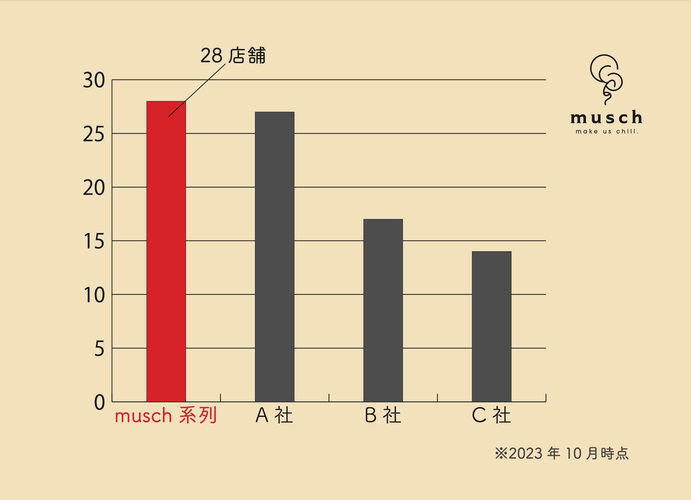 当社ではこれまで「五感を楽しませる」をコンセプトに取り、シーシャのみならず目で見るもの、耳から入ってくる音など空間そのものにもこだわって参りました。都会にいながら落ち着いた空間で、時間を忘れてゆったりとできる場所の提供を目指し運営を続けて、多くのユーザーに愛された結果、この度のmusch梅田HEP前店のオープンをもちまして10月でmuschは13店舗、系列含めて28店舗と業界1位を達成いたしました。どんなシーンでも素敵な体験をご提供したい、お一人様でも気軽にご利用いただきたいという思いから、どの店舗も空間作りにこだわっております。