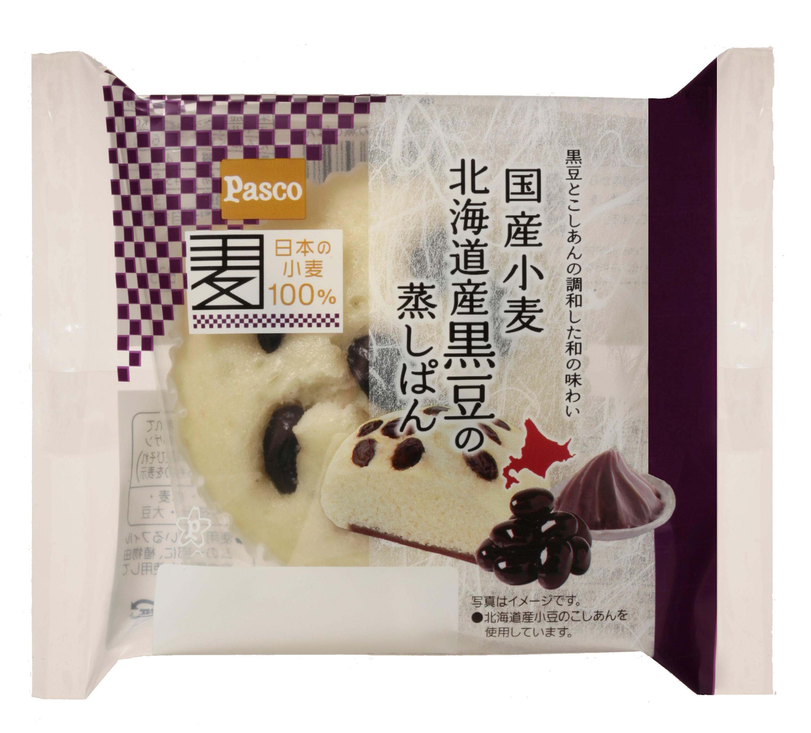 「国産小麦 北海道産黒豆の蒸しぱん」は、生地に国産小麦の小麦粉を100%使用し、トッピングには北海道産黒豆のかのこを、底面には北海道産小豆のこしあんを敷いて蒸しあげています。