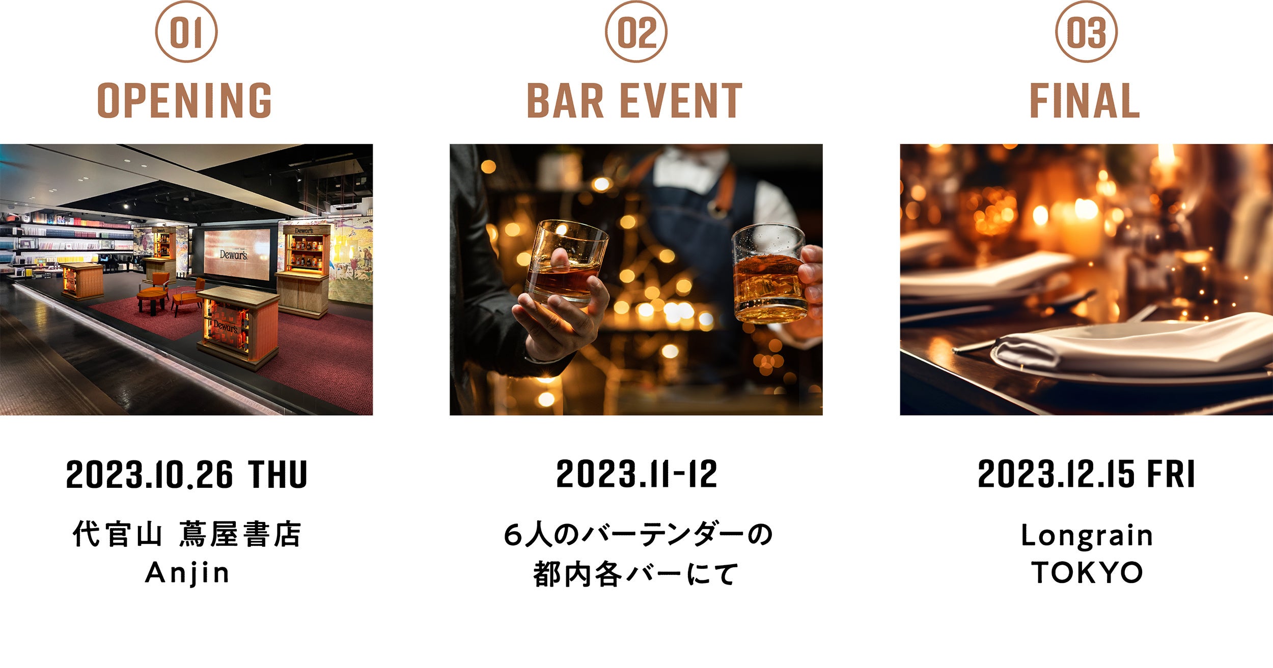 本プロジェクトは、プロジェクトのスタートとなる「オープニングイベント」、6 人のバーテンダーが営むバーで新しく開発したカクテルを体験する「バーイベント」、そして、カクテル全6 種およびカクテルと同じ食材を使った料理を味わう、プロジェクトの集大成となる「ファイナルイベント」の3 つの参加型イベントで構成されています。すべてのイベントで、プレミアムラインのダブルダブル21年もお楽しみいただけます。イベントに参加することで、デュワーズが掲げる「好奇心」と「探究心」の世界観を追いかけ、堪能いただけます。