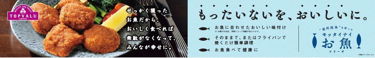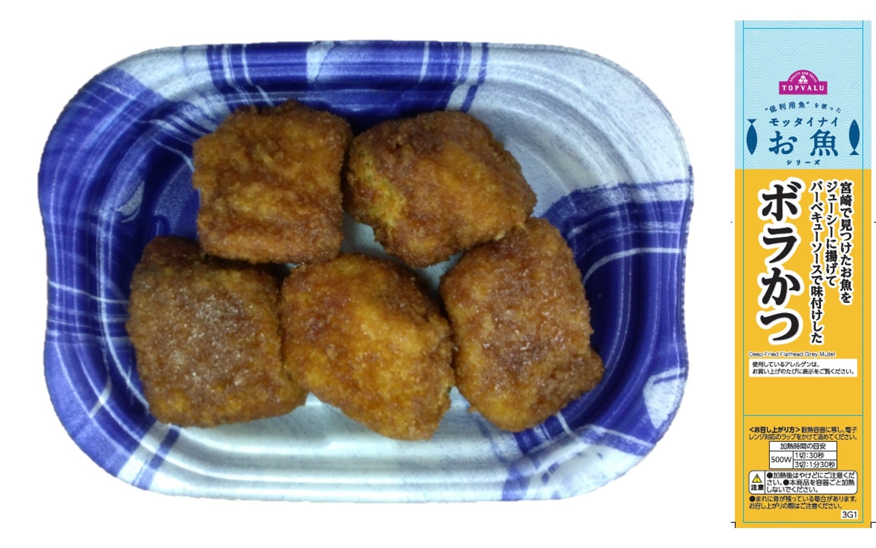 低利用魚は漁獲しても、商品化されずに多くは廃棄されてしまうことから、近年はせっかく獲れた魚がもったいないと問題になり、食用として有効活用する取り組みが広がっています。こうしたなかイオンでは、大手水産会社と協働することで原料を確保し、今年4月に低利用魚を活用する「モッタイナイお魚シリーズ」第1弾を発売しました。第2弾では、からすみの原料となる卵を取った後のボラの身を活用した「ボラかつ」と、「焼くだけ簡単ラクラクさかな」から新魚種2種類が登場します。
