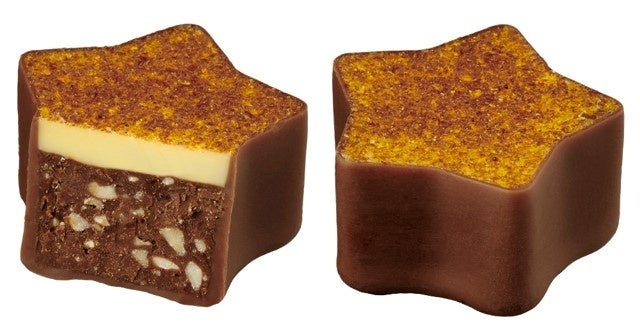 はちみつとジンジャーが香る、さくさくとした食感が楽しいくるみのプラリネを、可愛らしい星形のミルクチョコレートのカップで包みました。