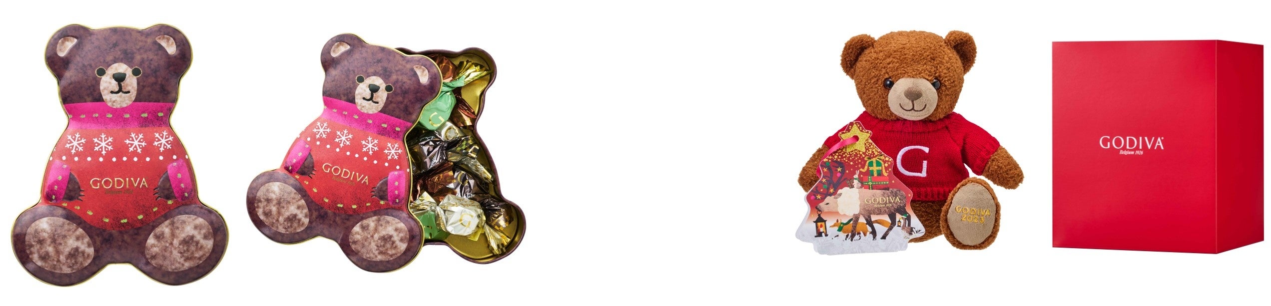 動物たちを描いた赤いベア形のパッケージに、夜空に輝く星や月、雪が降り積もるもみの木、森の中でライトアップされたクリスマスツリーをイメージした限定チョコレートと、ゴディバのハート(まごころ)を象徴するクールやクールノアなどのチョコレートを詰め合わせました。