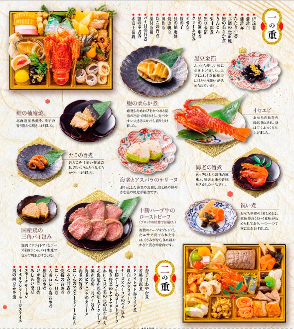 上記を含む、新年にふさわしい厳選食材にて、44品目を丹精込めて作り上げました。