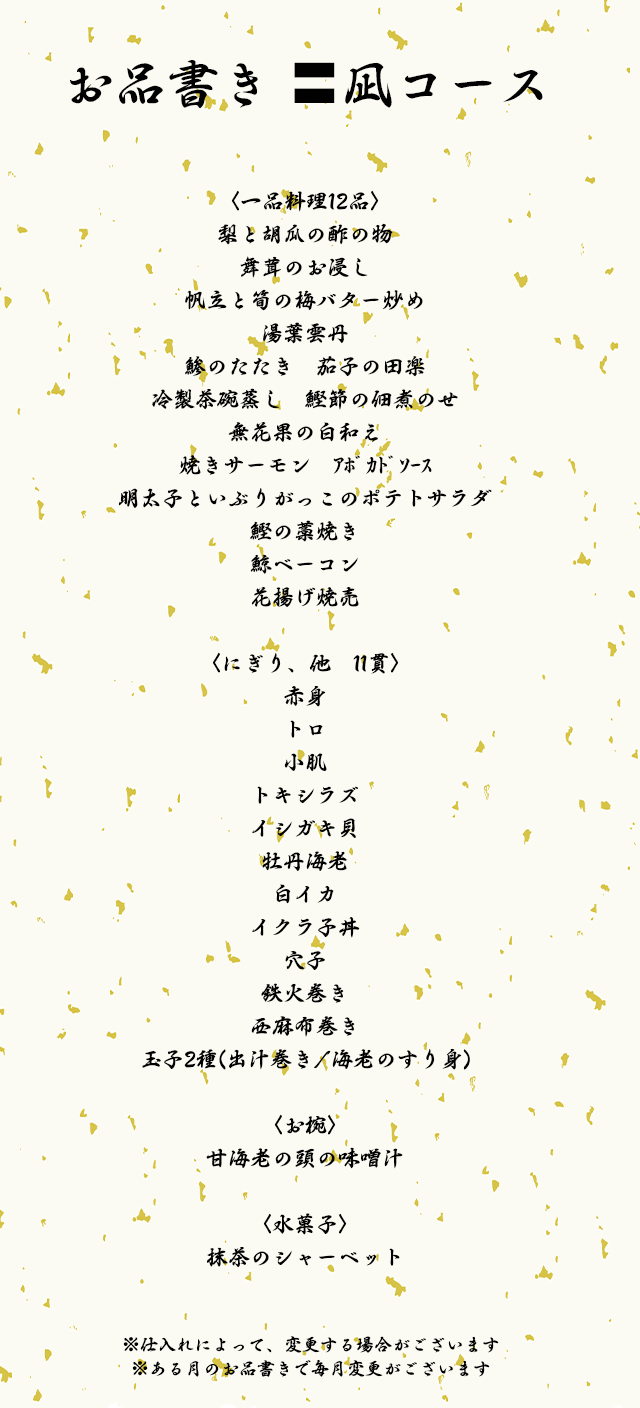 〓凪コースは時期に応じて旬の食材を使った一品料理を12品、握り11貫などの26品をご提供!至高の味を心ゆくまでお楽しみください。