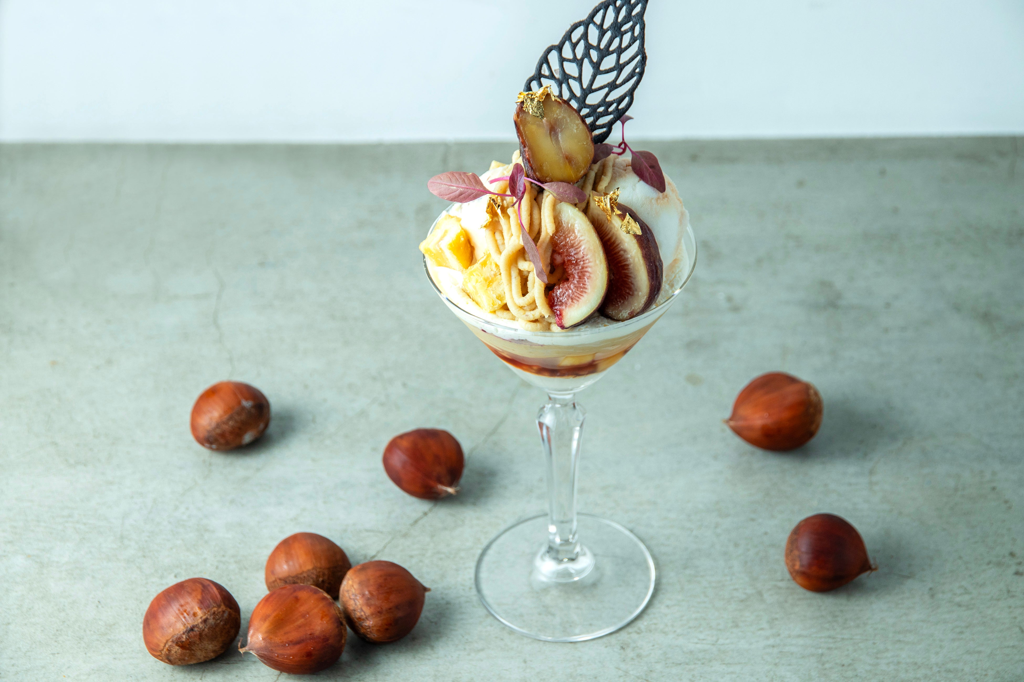 茨城笠間の栗や丹波栗をクリームや渋皮煮にして栗本来の香りや甘みを残しつつ、今美味しい洋梨やいちじく、そして塩キャラメルのアイスとラムレーズンのアイスを載せたボリューミーな贅沢パフェです。栗にはない華やかさを香り高いラフランスを使い、香りのアクセントに。また栗やラムレーズンに合ういちじくを使うことで、甘さやとろみのあるテクスチャーを食感のアクセントにしました。