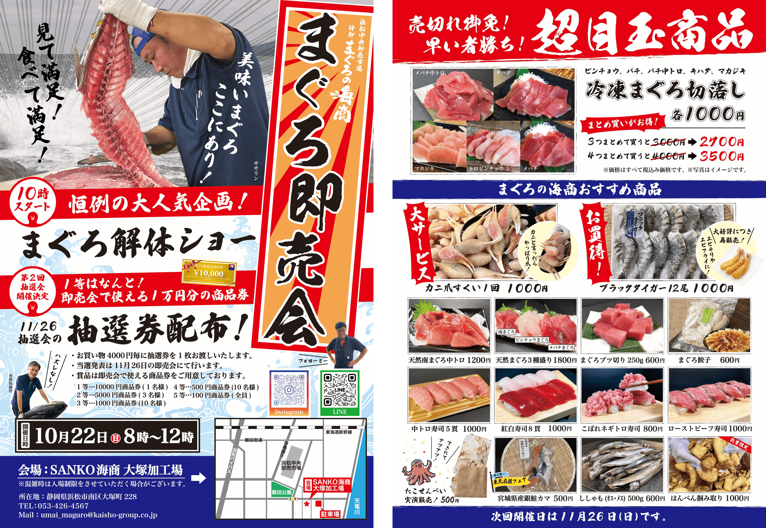 SANKO海商のまぐろ即売会は進化が止まりません!人気のまぐろ解体ショーに加え、お客様のアンコールに応えて第二回抽選券の配布、東北応援フェア商品として今月は「宮城県産銀鮭カマ500円」を販売いたします。また、先月大好評だった「たこせんべい」の実演販売も登場!SANKO海商のまぐろ即売会は、年末に向けてさらに加速してまいります。