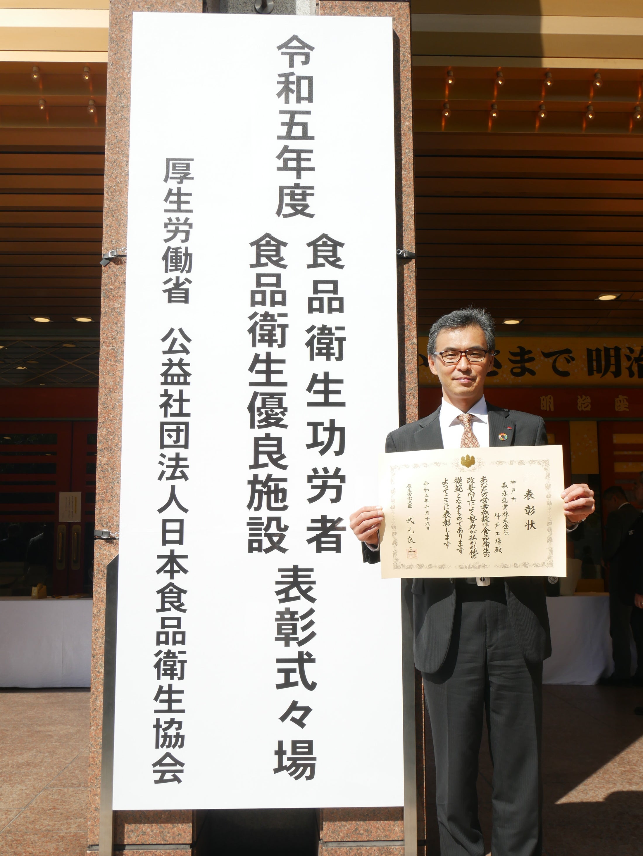 表彰式は、10月19(木)に明治座(東京都中央区)にて開催され、今回、受賞した厚生労働大臣表彰「食品衛生優良施設」83施設を代表して、当社の神戸工場が表彰を受けました。