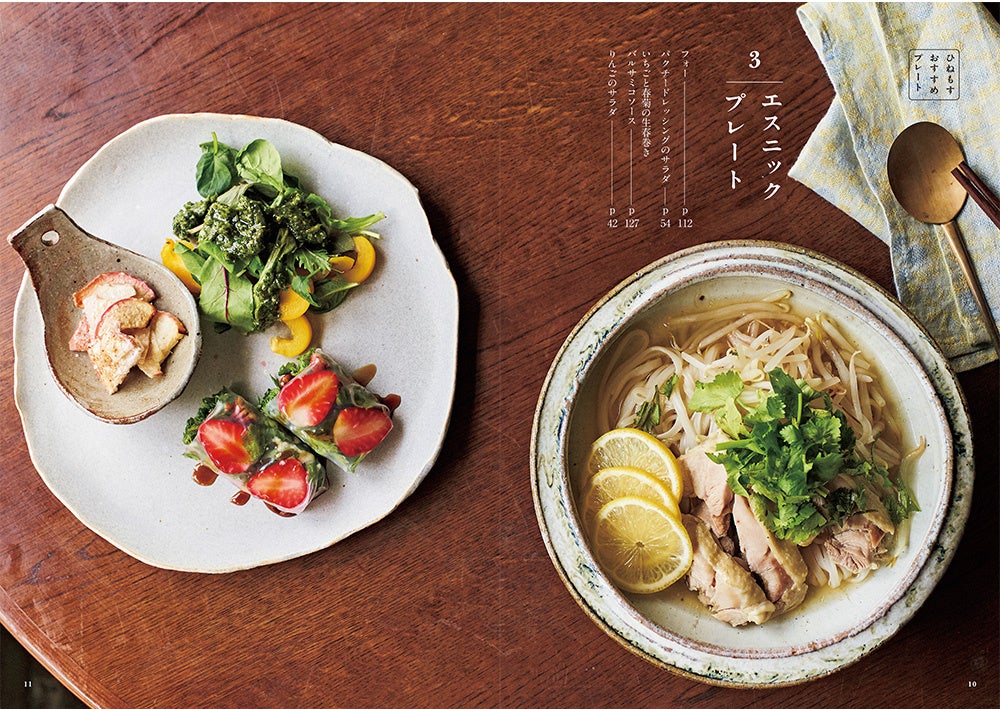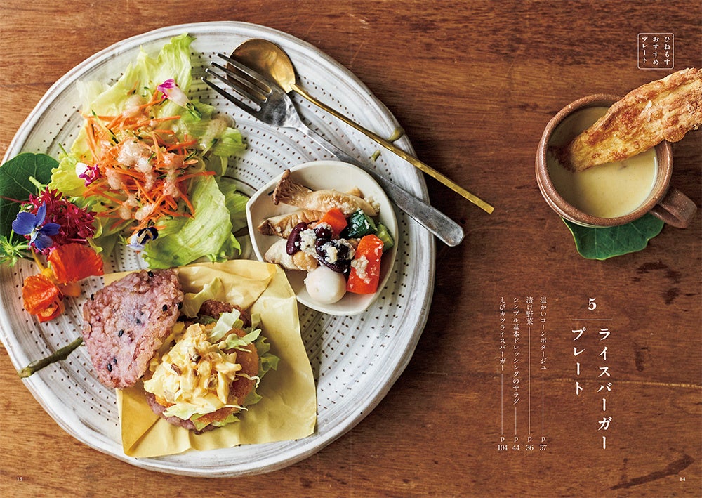 ●「ひねもす発酵研究所」ならではの、ちょっとたのしい一皿も紹介。たまねぎ麹を使ったケークサレ、えびカツライスバーガー、チーズフォンデュ、フォー、ベジテリーヌ、ガランティーヌ……などバラエティ豊かな19レシピです。