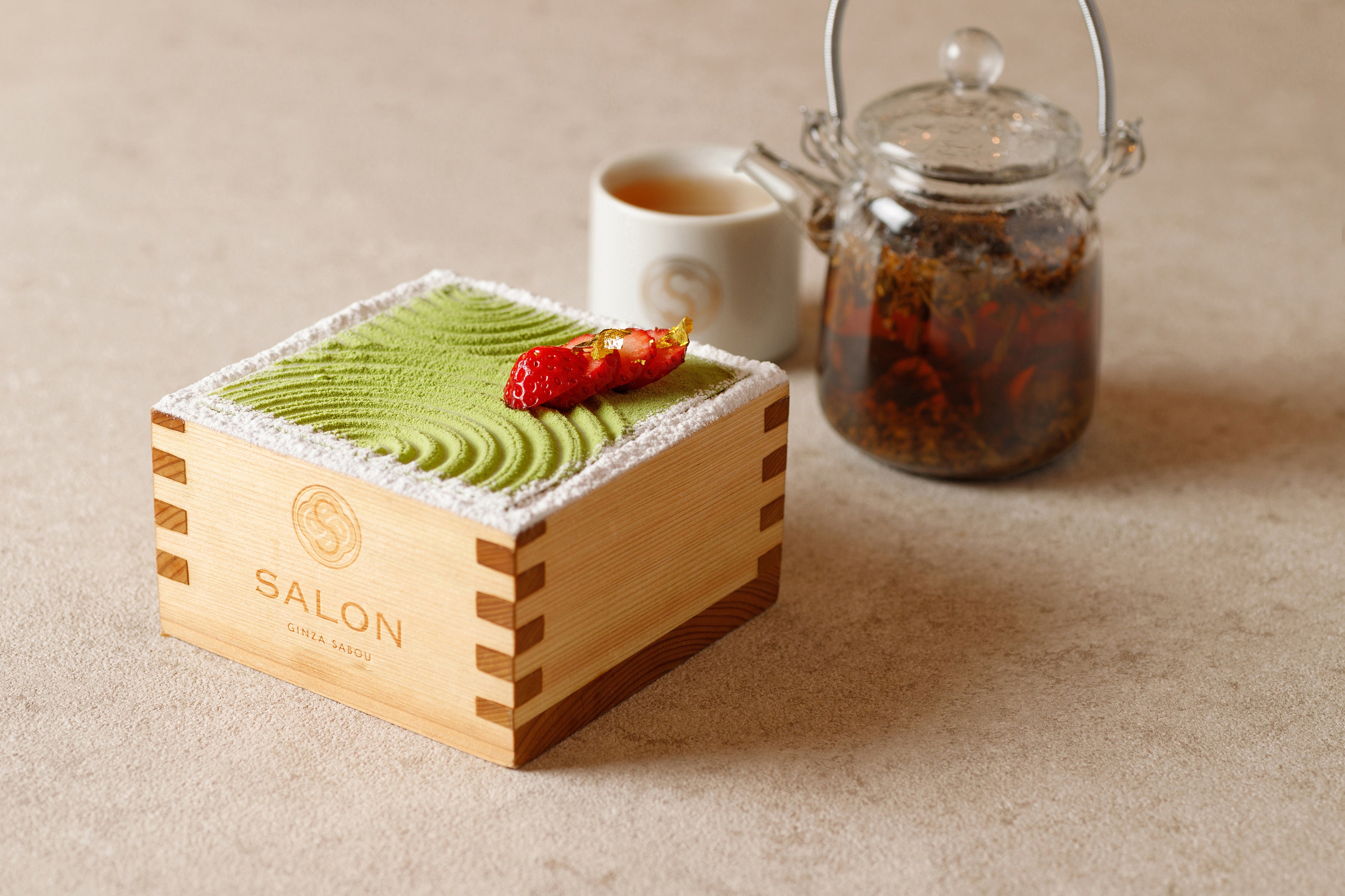 銀座茶房の看板でもある「日本庭園風 桝パフェ」。抹茶パウダーで美しく枯山水に見たてたホワイトチョコレートを割ると、抹茶のマスカルポーネ、栗の渋皮煮、抹茶の寒天、白玉など和の甘味の他、クッキーやライスパフ、抹茶アイスなど日本が誇る抹茶づくしのスイーツがご堪能いただけます。和と洋の食感豊かな素材が詰まった一品です。
