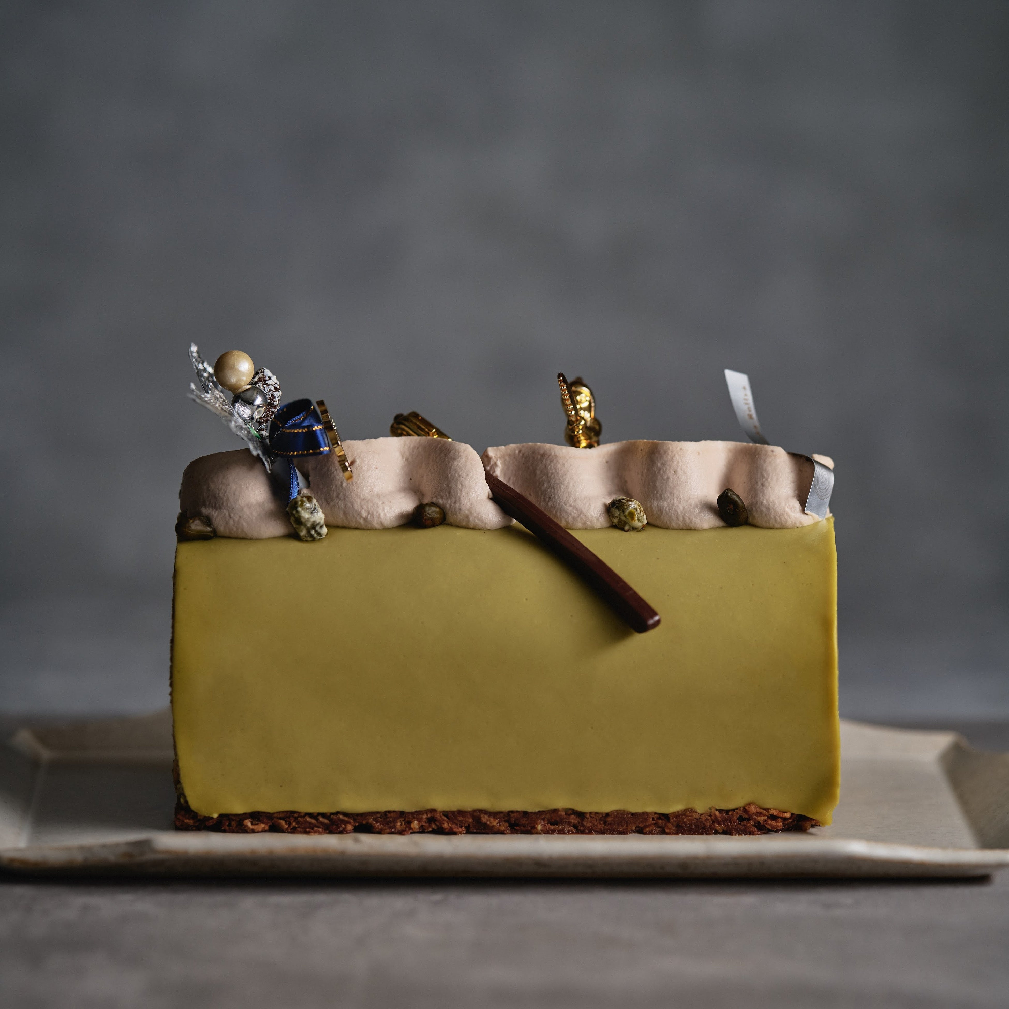 仕上げにピスタチオのグラサージュ、土台のロッシェショコラが食感に楽しい変化を加えます。