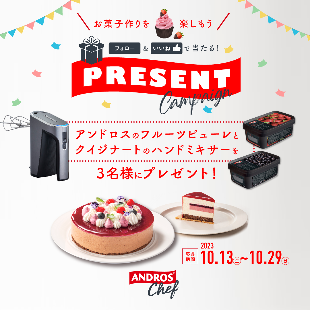 フランスのフルーツ加工メーカー「andros(アンドロス)」は、2023年10月13日(金)~10月29日(日)の期間中、Instagramキャンペーンを開催いたします。当選者の3名様にはアンドロスのフルーツピューレ2種類とクイジナートのコードレス充電式ハンドミキサーをセットにしてお届けする予定です。