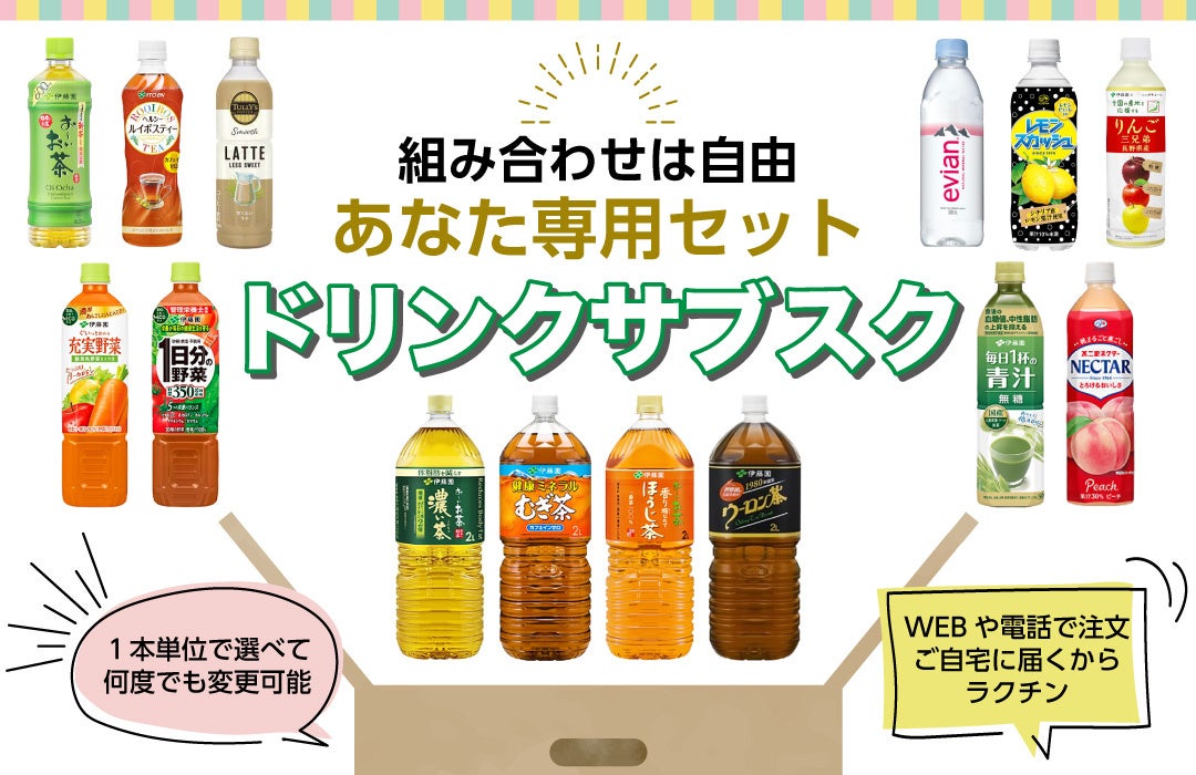『よりどりドリンク宅配サービス』は、おーいお茶やレモンスカッシュ、コーヒーなどおなじみの飲み物40種類以上の中からお好きな物を1本単位で組み合わせ自由に選ぶことができる、ありそうでなかった通販限定の箱売り宅配サービスです。