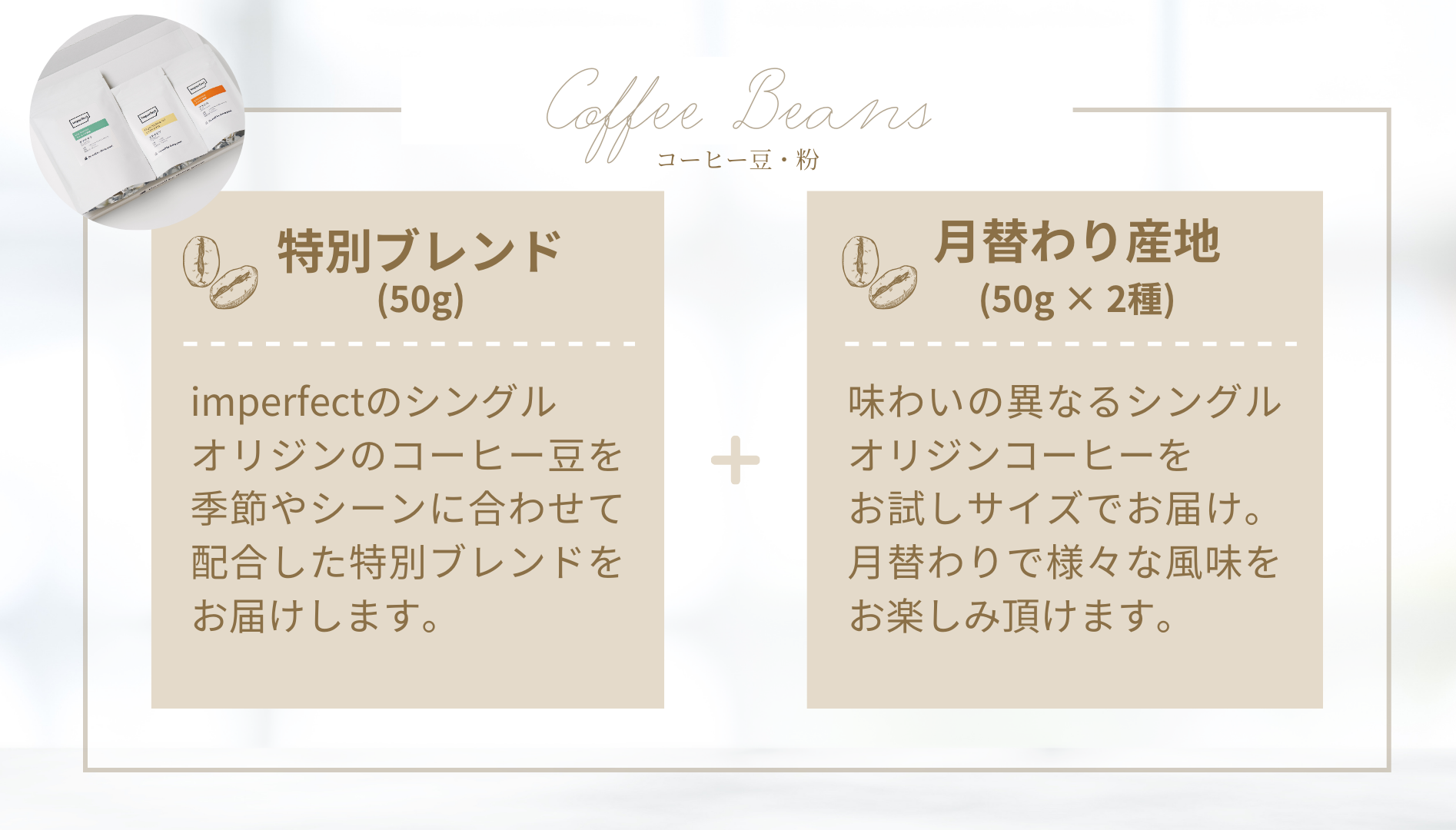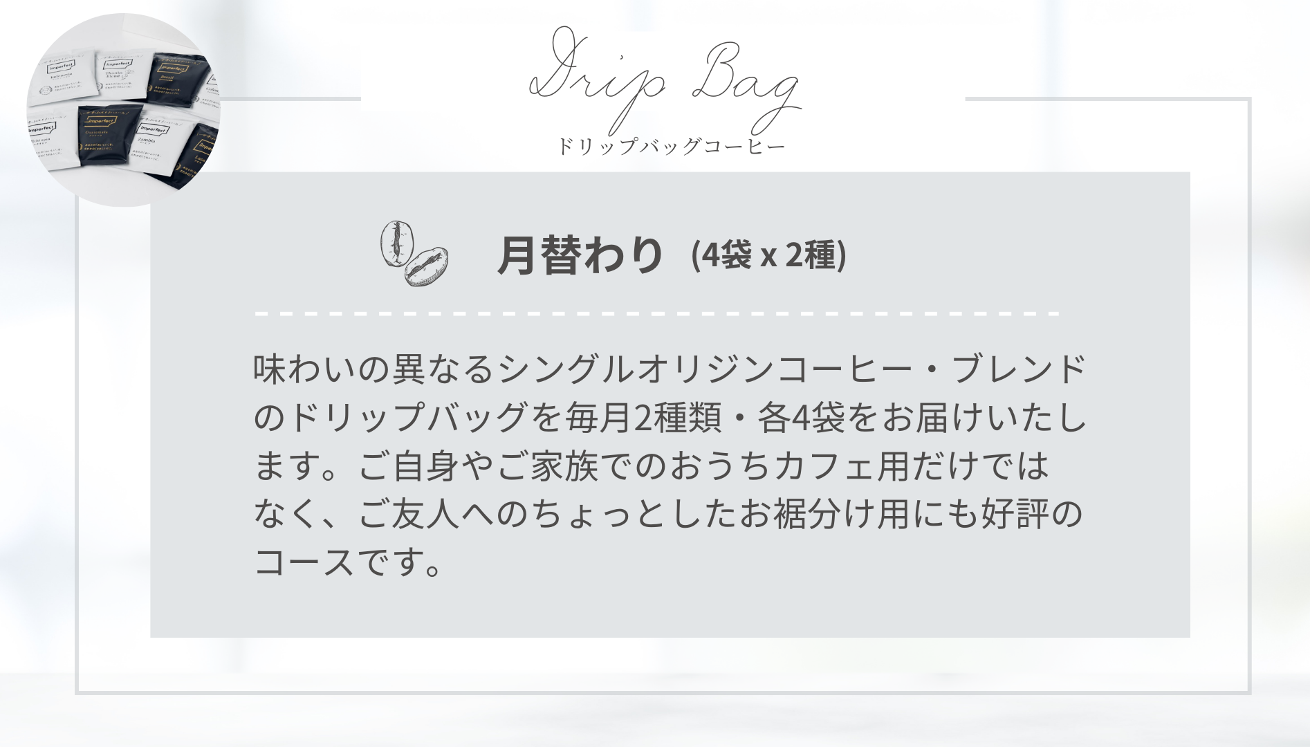 今般imperfectが本格展開を開始するのは、imperfectこだわりのブレンドコーヒーと、 厳選してお届けするシングルオリジンコーヒーが、月替わりで毎月ご自宅に届くサブスクリプション・サービス。