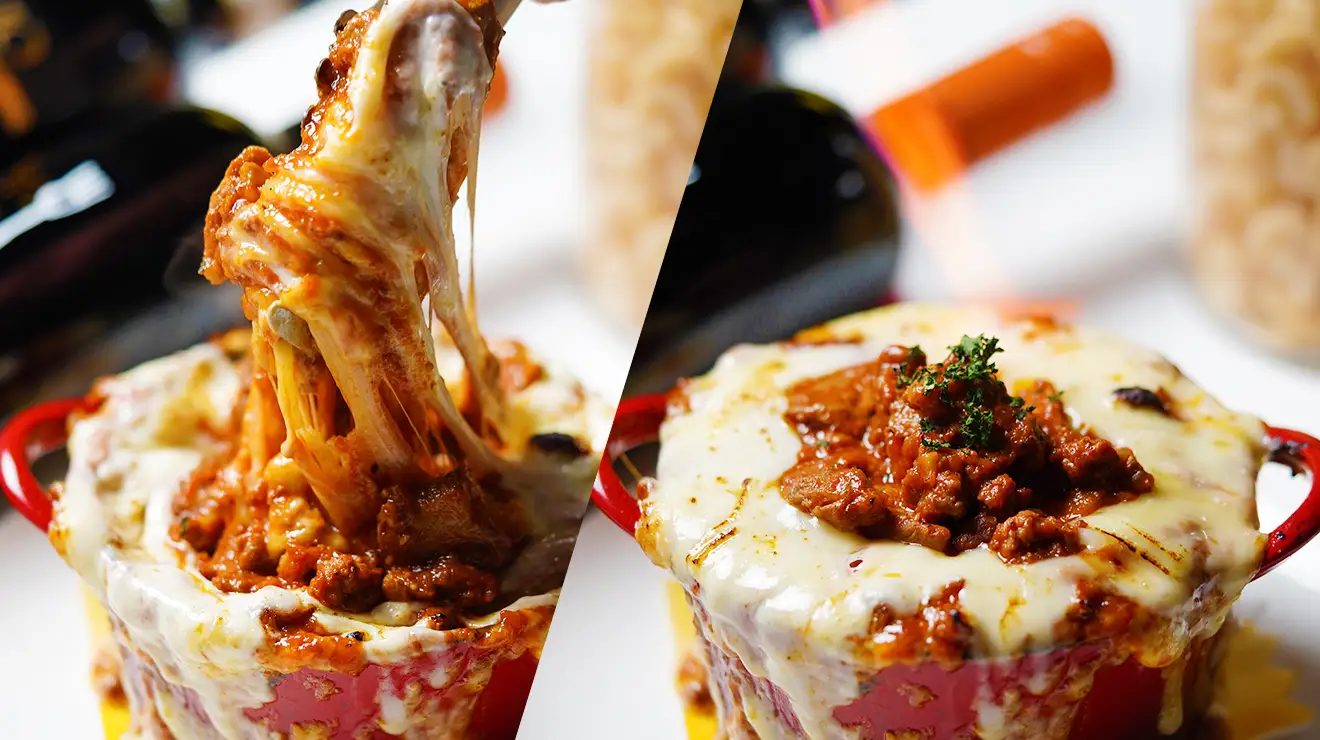 お肉がゴロゴロ入ったボロネーゼを中に閉じ込めていて、香ばしい炙りチーズで蓋をしたインパクト抜群な逸品!