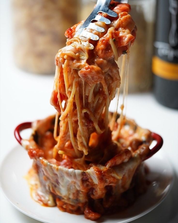 【チーズが流れ落ちる】ミートボルケーノパスタの動画はこちら▽