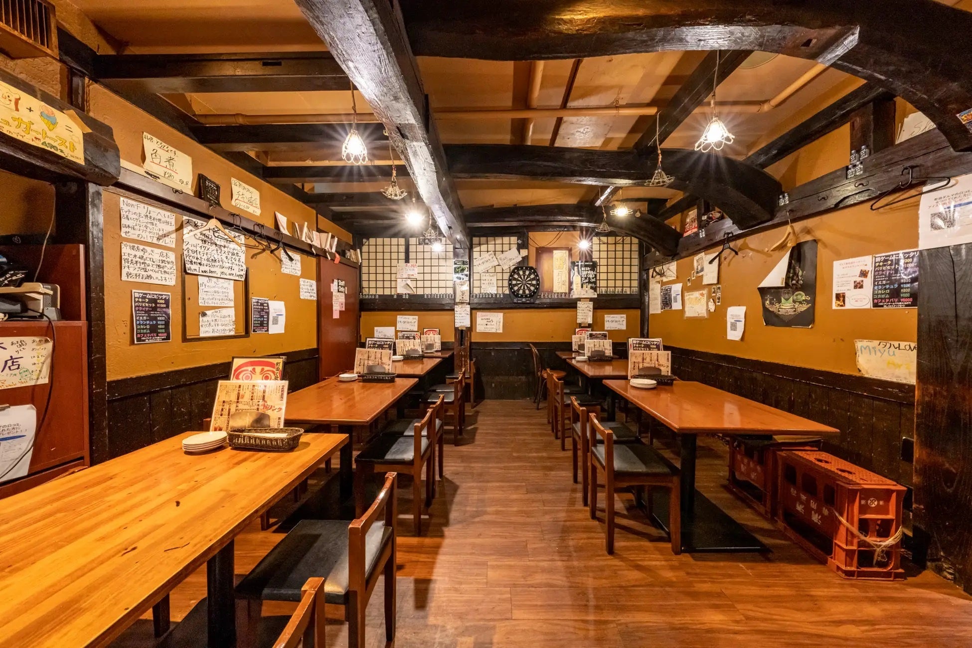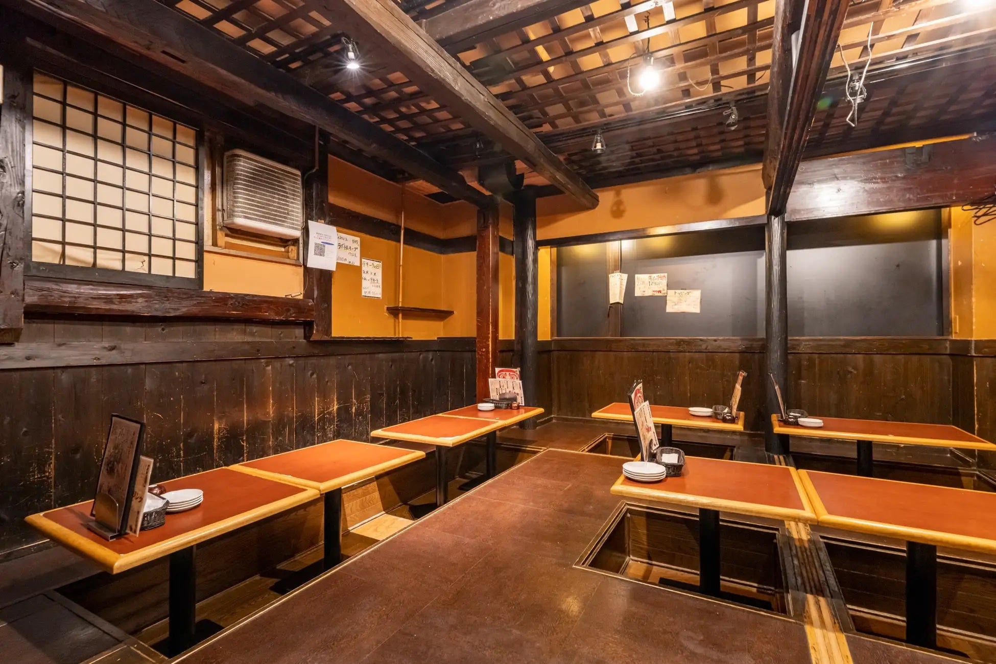 掘りごたつのお席で最大収容数60名、テーブルのお席で25名と忘年会のシーンで大活躍の広々した店内。