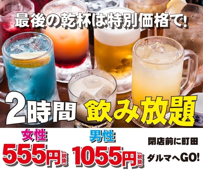 閉店前に町田ダルマへGO! 期間は2023年10月23日(月)~12月末まで。2時間飲み放題が女性555円、男性1055円で楽しめます。