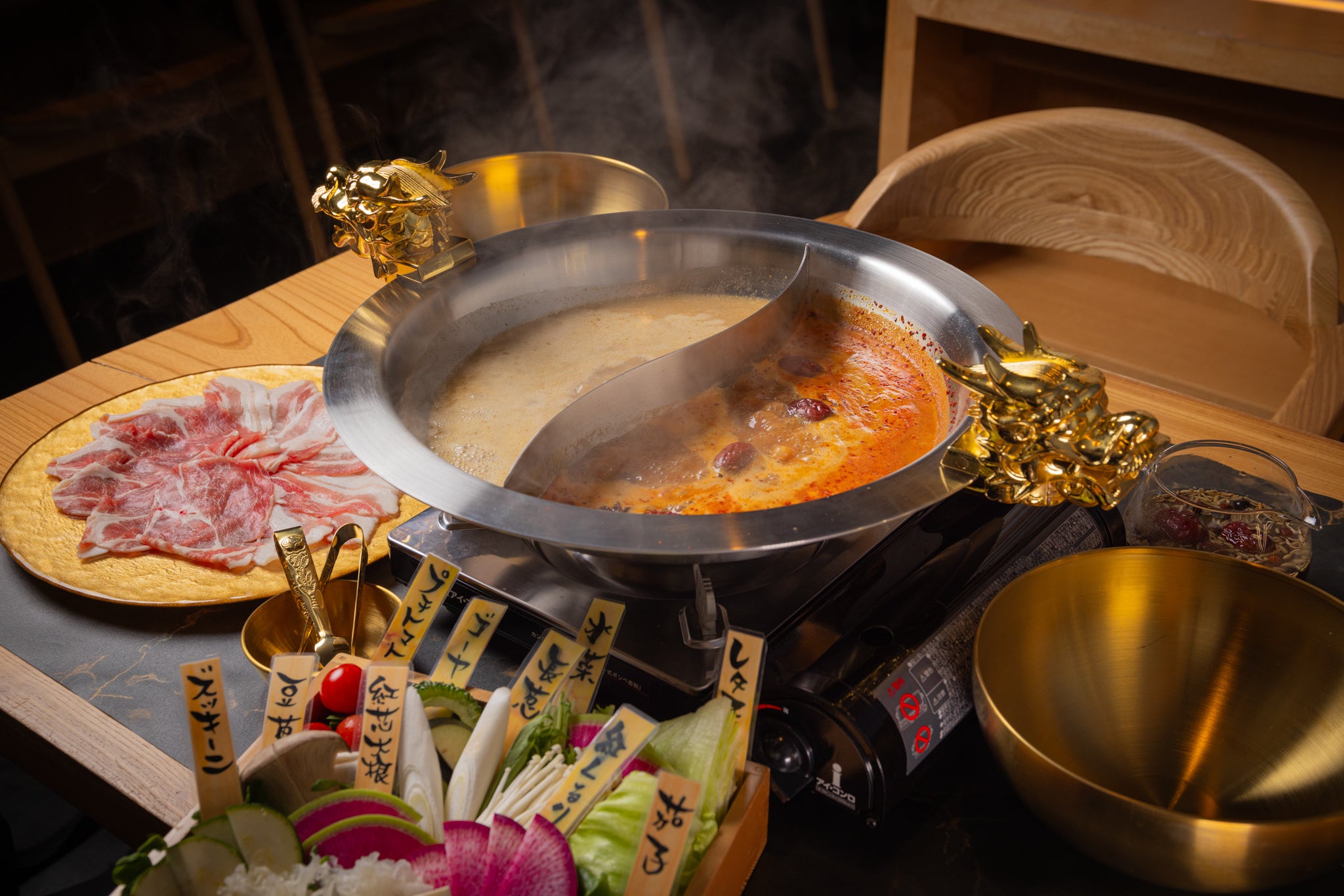 唯一無二の魚骨スープと、魅惑の旨辛スープから成る二食鍋。
