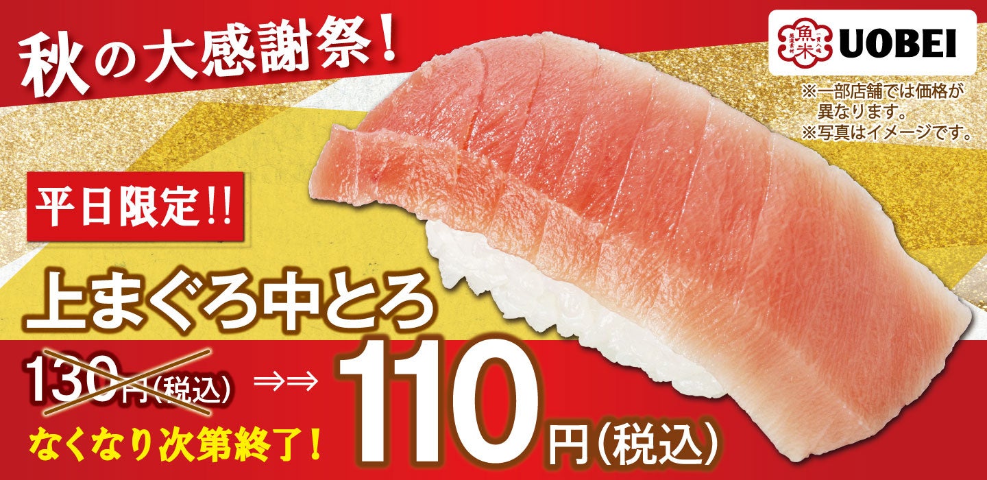 2023年10月23日(月)からの期間限定で、旨味がたっぷり詰まった魚べい自慢の「上まぐろ中とろ」を、通常価格1貫130円(税込)のところ、平日限定特別価格110円(税込)で販売いたします。